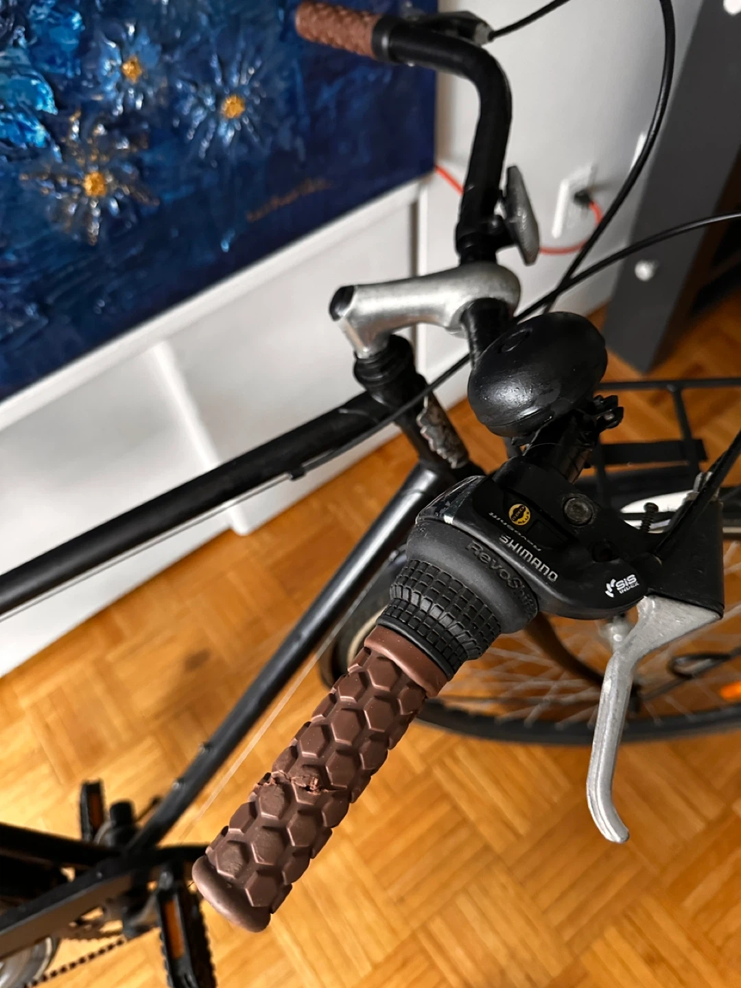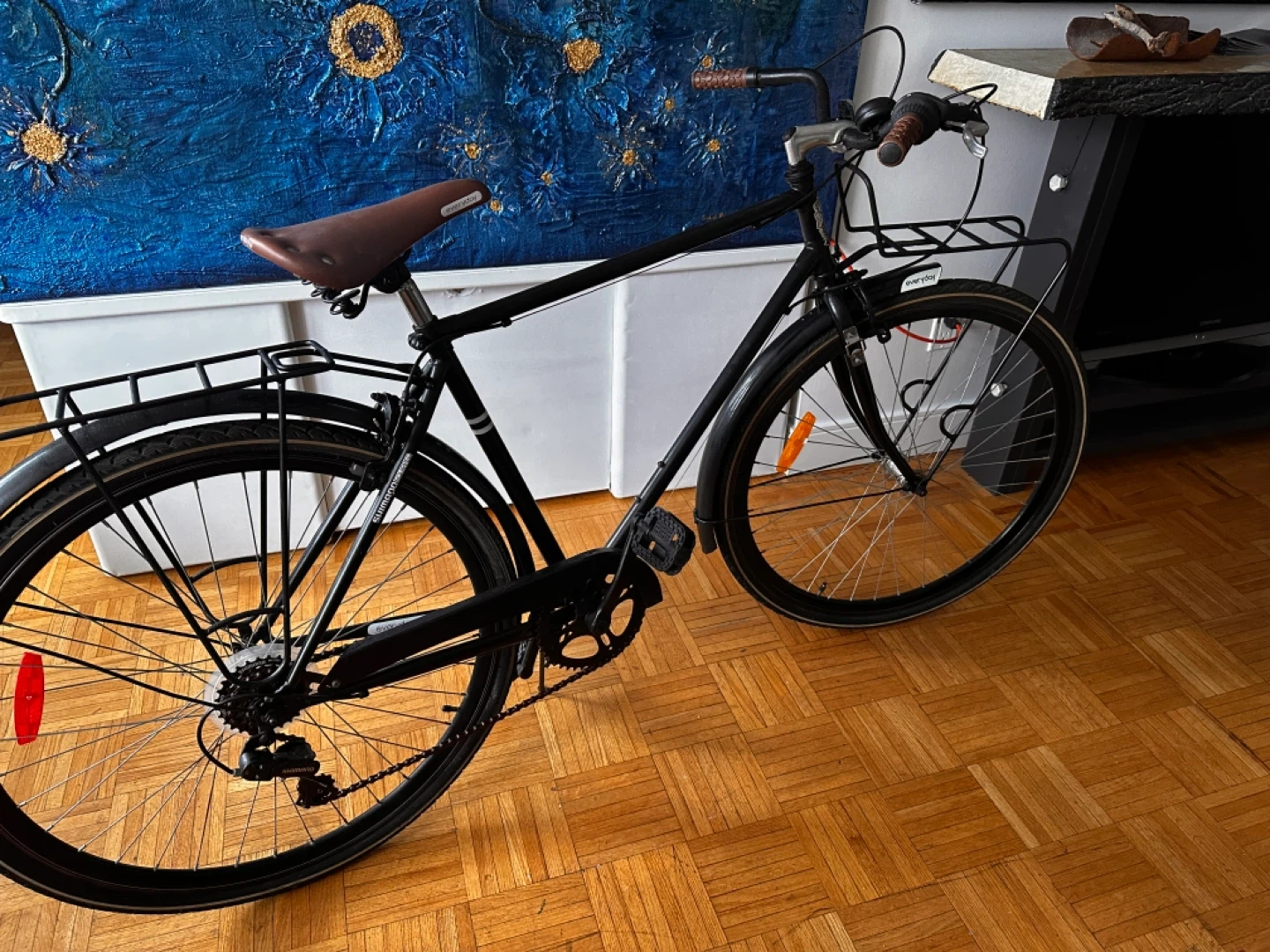Black commuter bike with front and rear racks. Features Shimano gears and brown grips. It's ready for your daily rides!