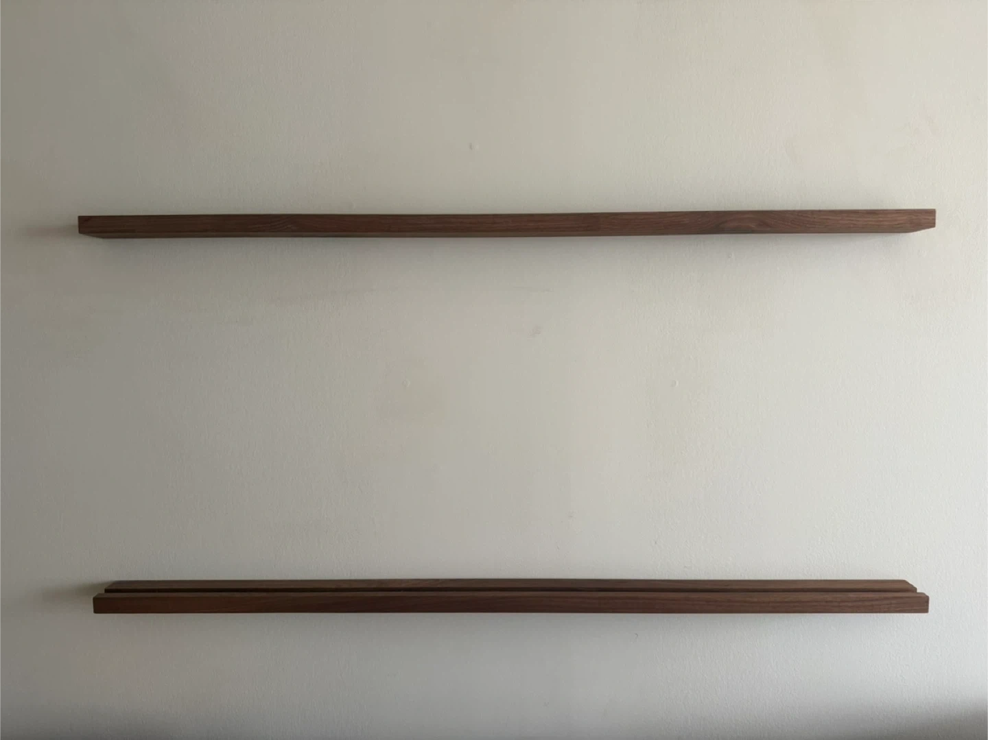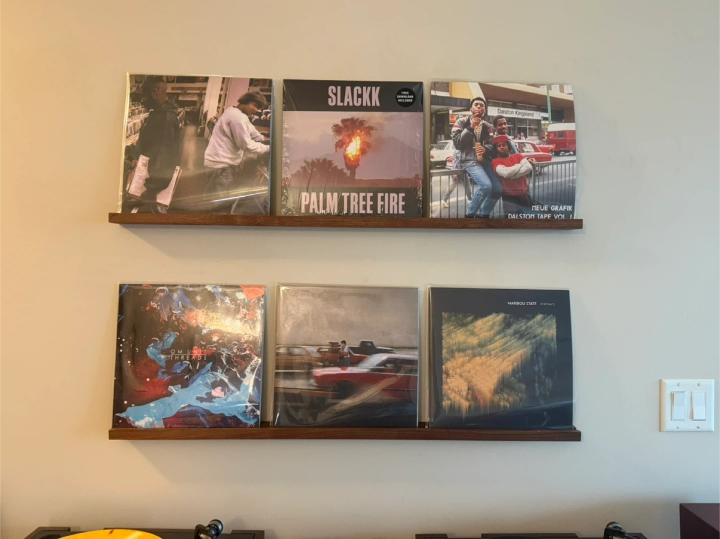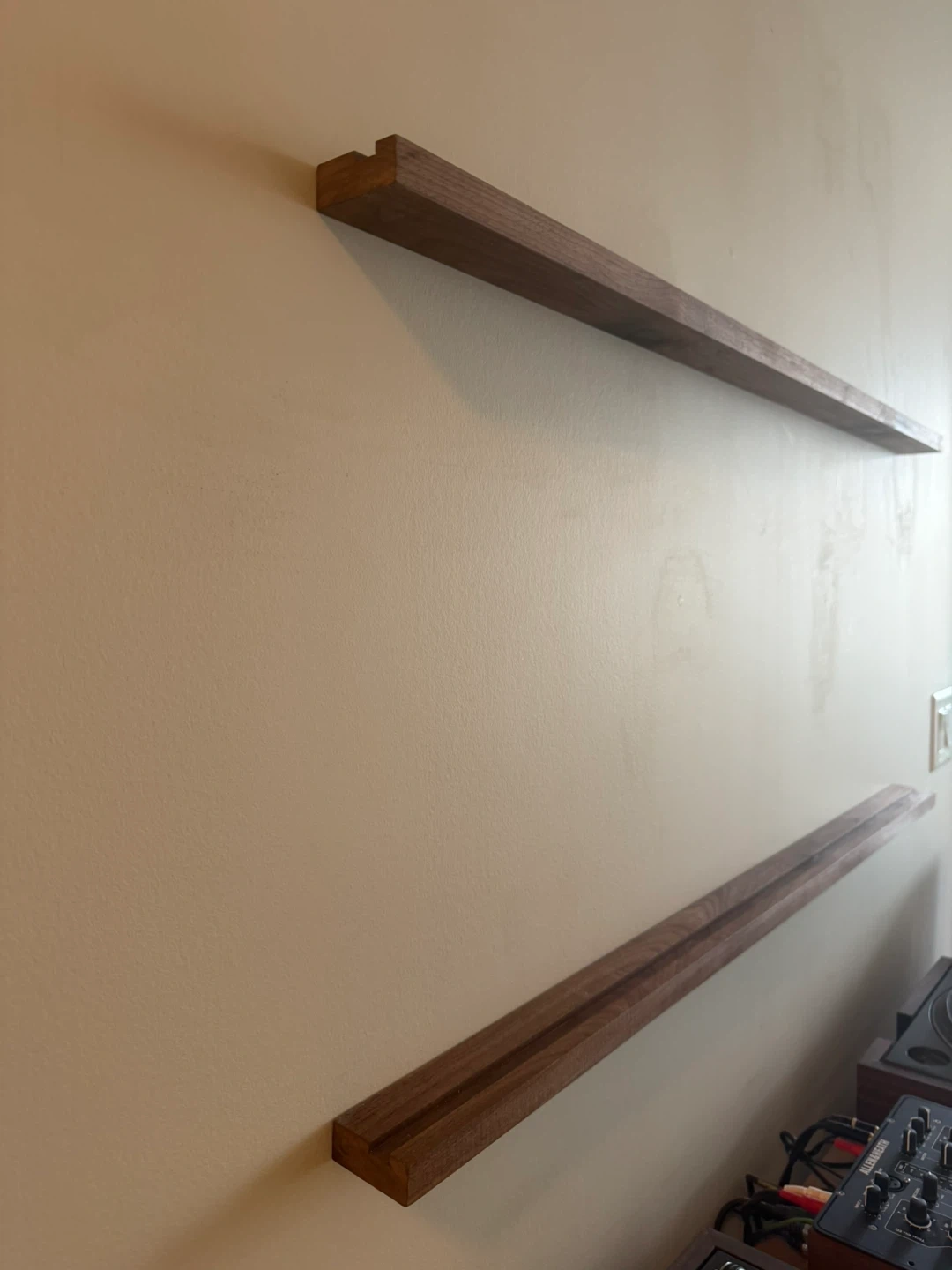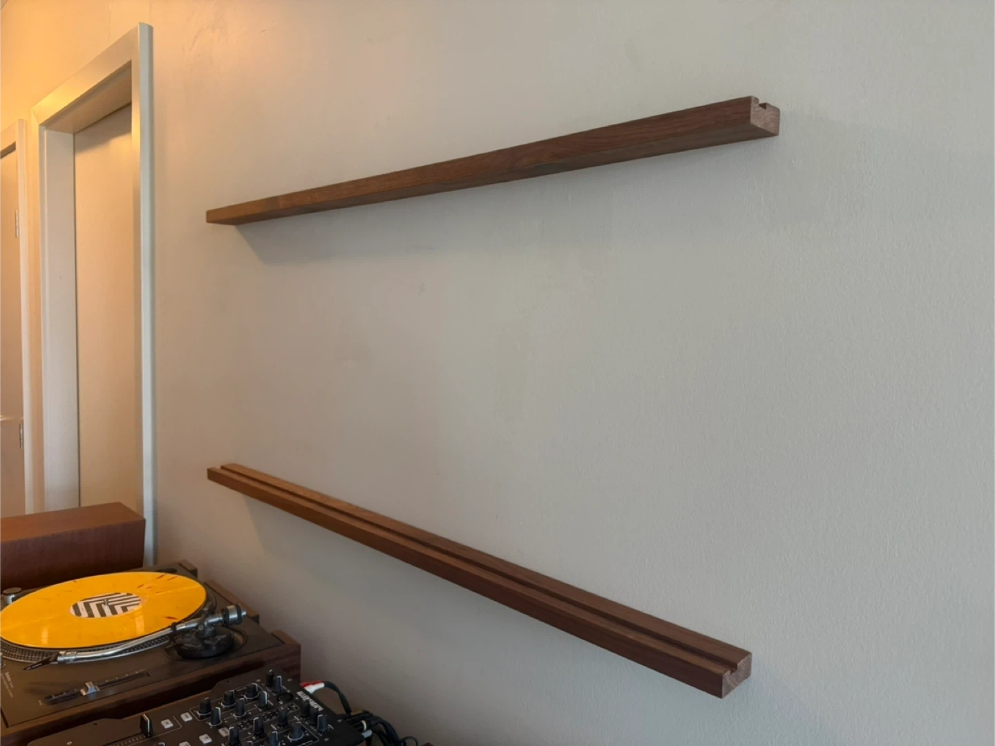 Vinyl record display ledge shelves. Made of hardwood (walnut).