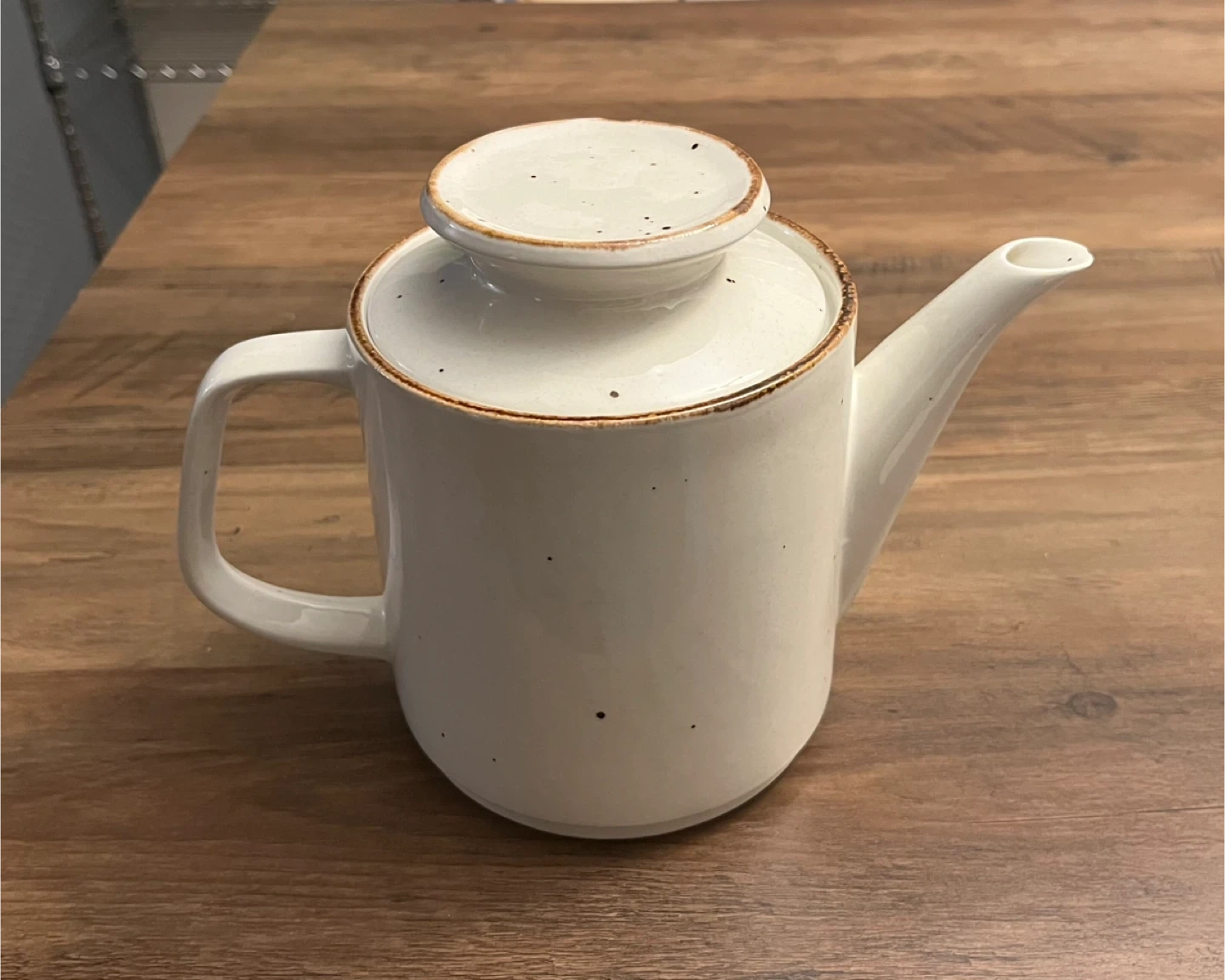 This is a "Lifestyle" teapot from J&G Meakin, made in England. It's oven-to-tableware and features a speckled off-white ceramic design. Great for serving hot beverages!