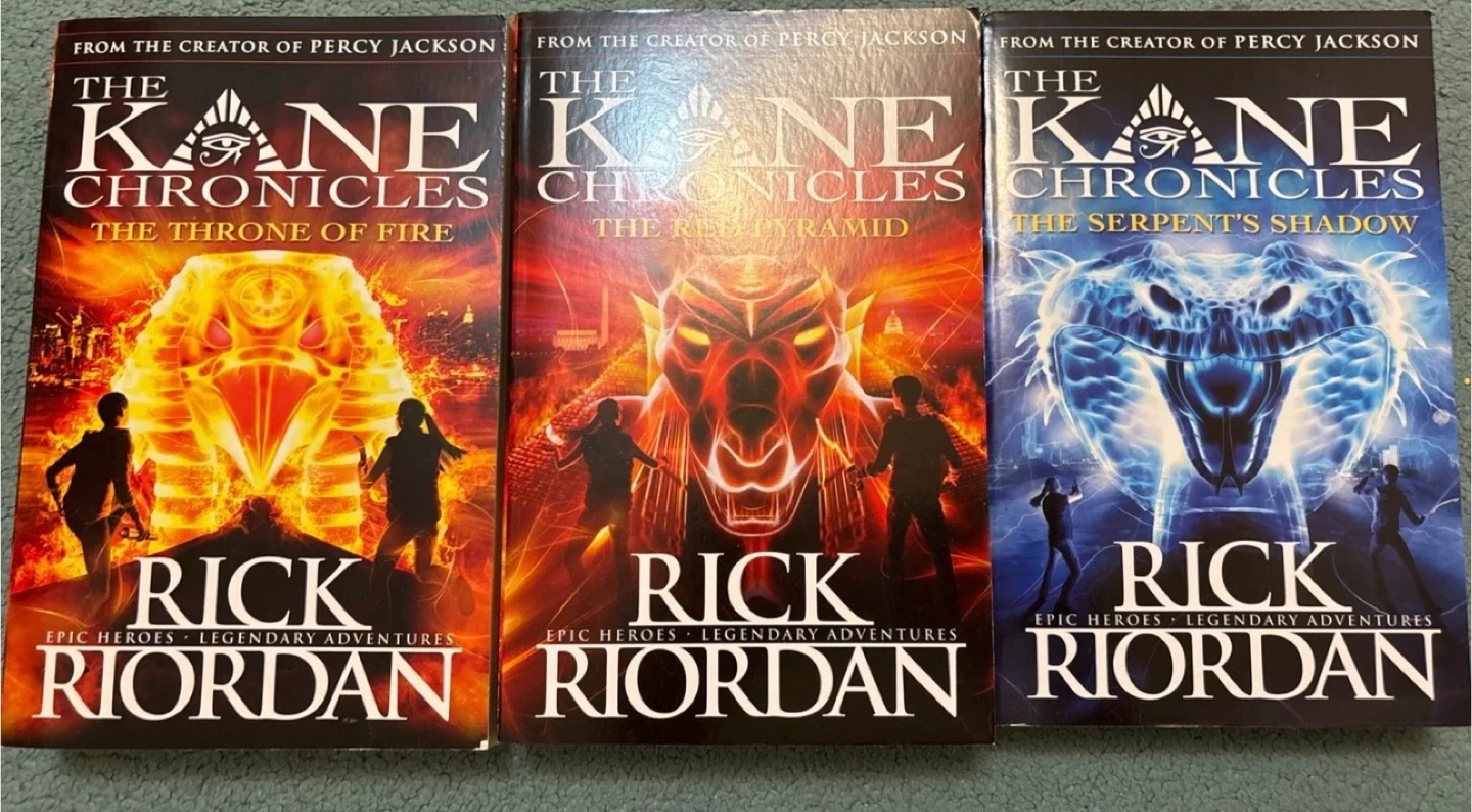 This is a set of three books from The Kane Chronicles series by Rick Riordan. They include The Throne of Fire, The Red Pyramid, and The Serpent's Shadow. Perfect for tweens and teens and Percy Jackson fans!