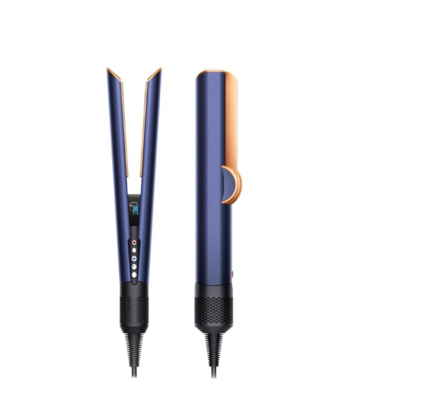This hair straightener is a deep blue with rose gold accents. It features digital temperature controls and indicator lights. The plates are designed for smooth gliding.