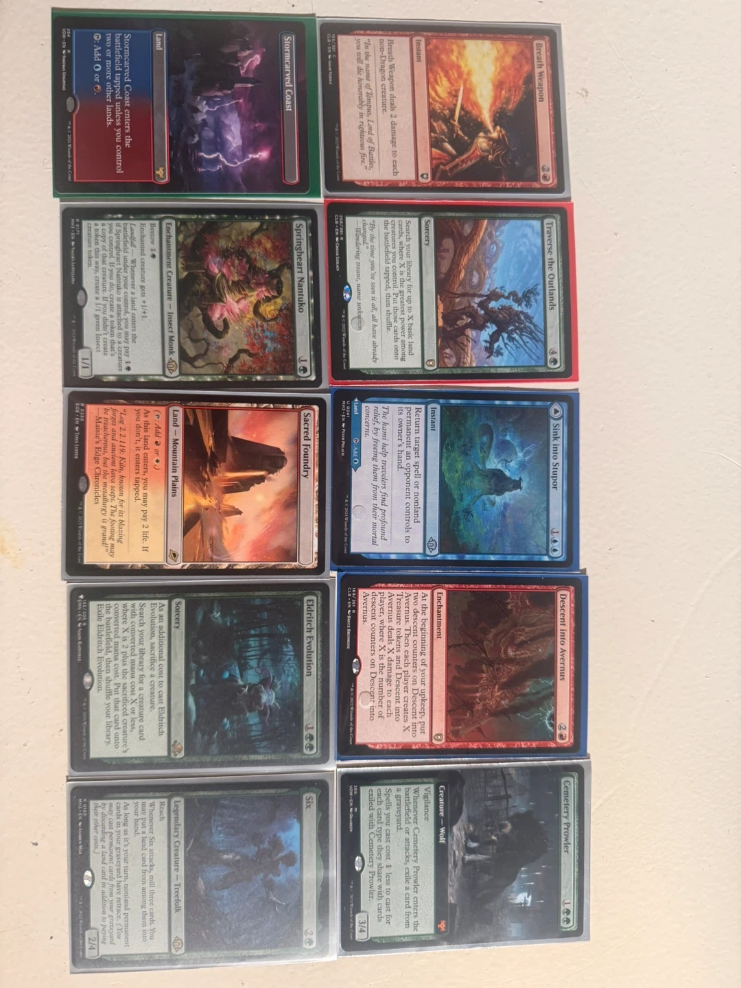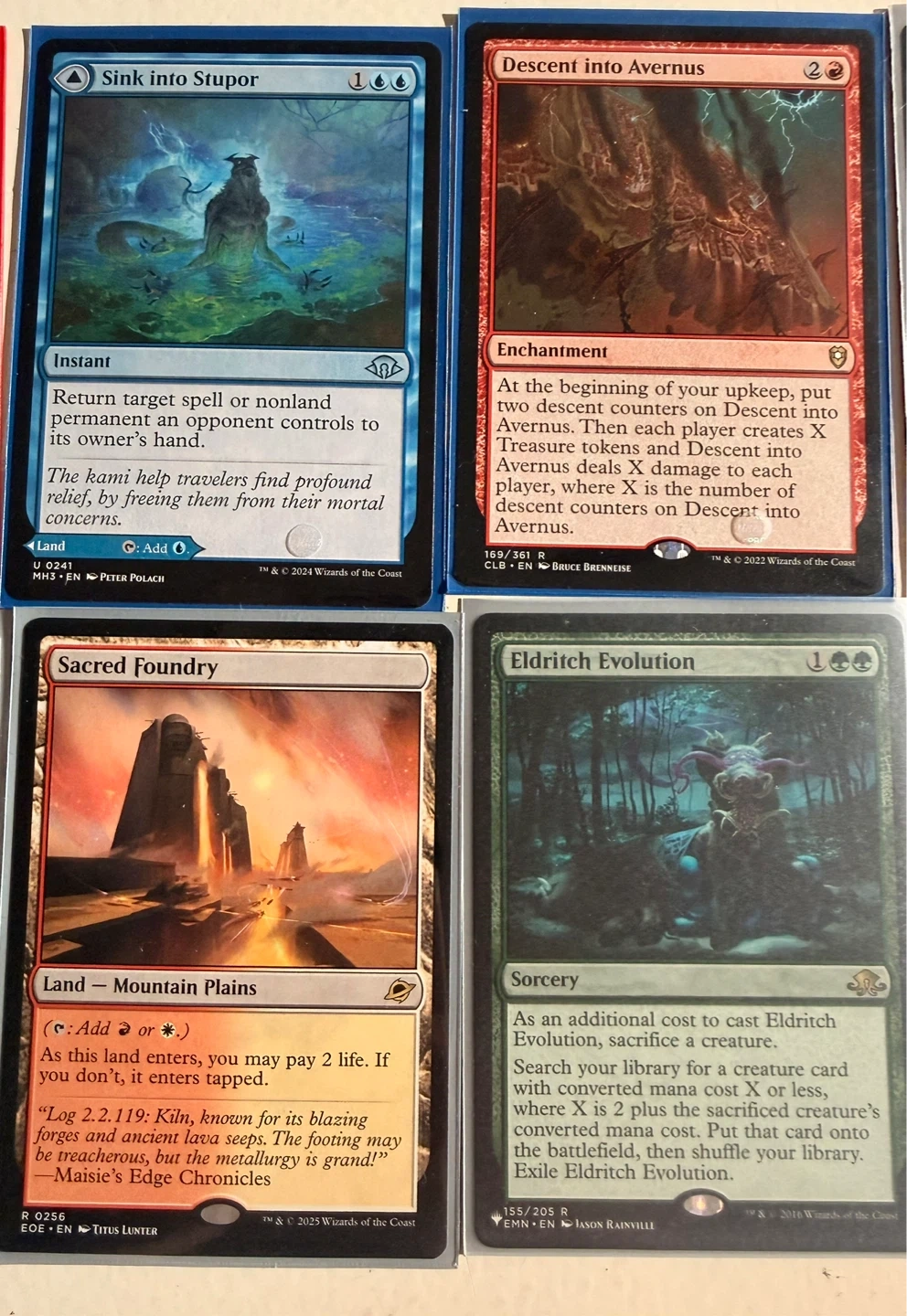 Includes several Magic: The Gathering cards such as Sink into Stupor, Descent into Avernus, Sacred Foundry, Eldritch Evolution, and more. These are collectible gaming cards. Selling all for $120 or message me for single prices? I go by cardkingdom pricing and take about couple dollars off.