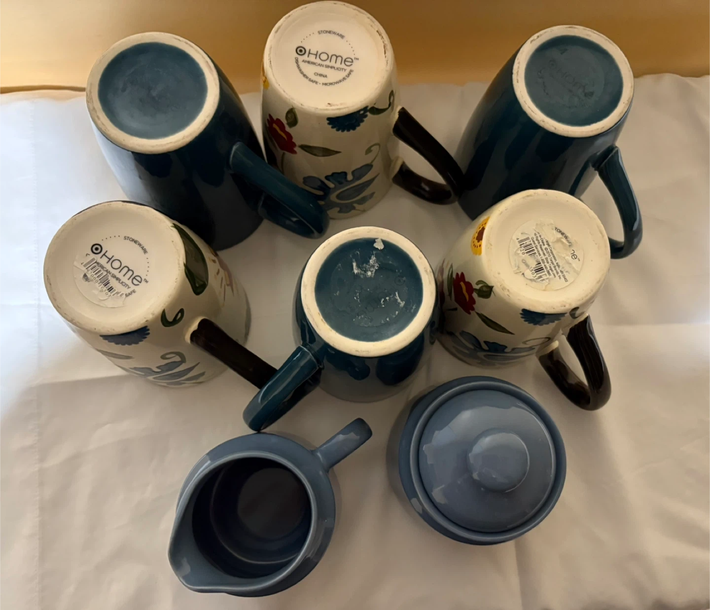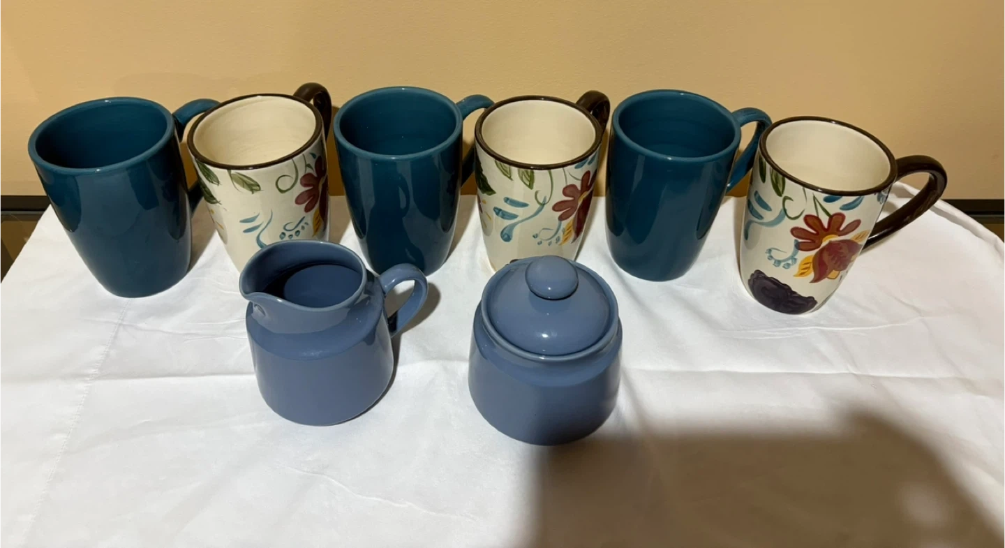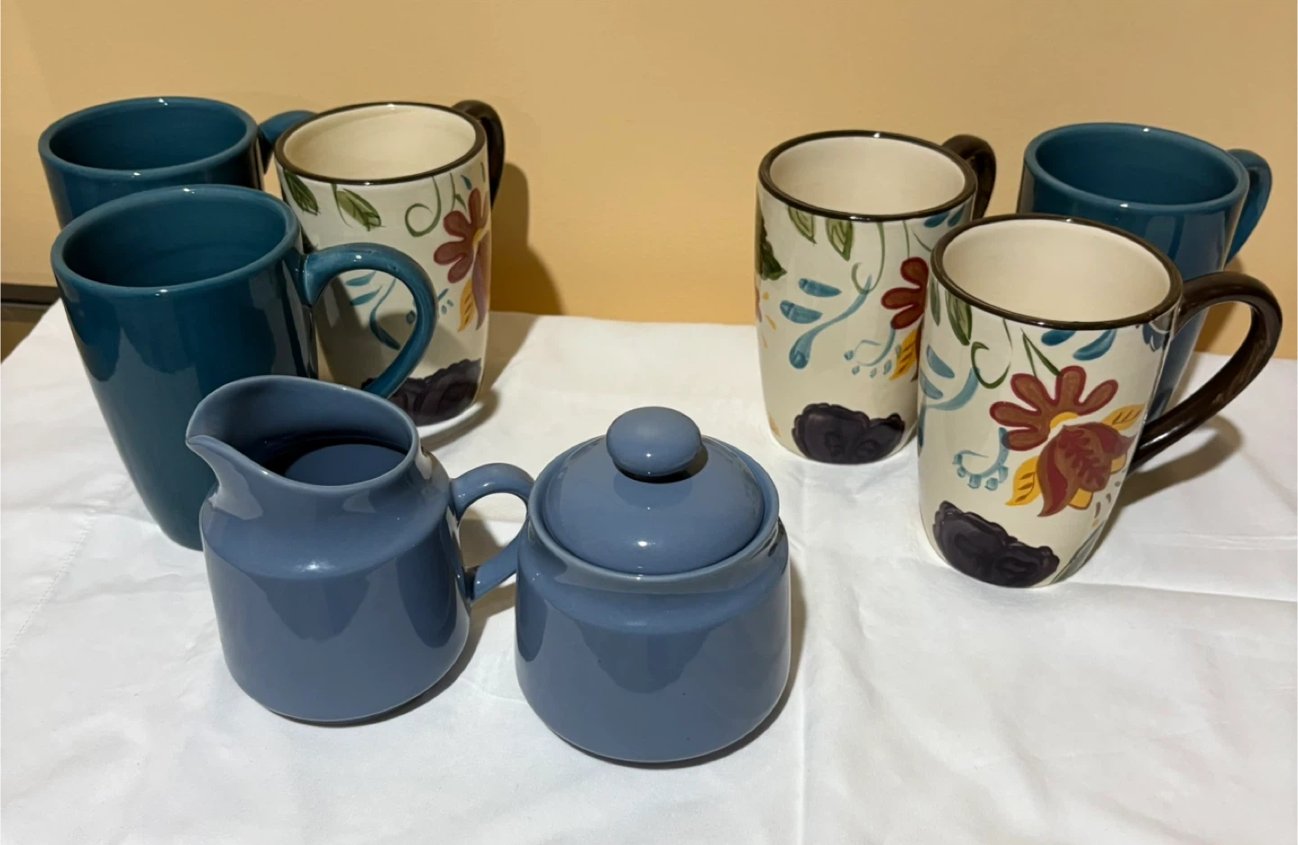 I'm selling a set of mugs from HOME American Simplicity. This set includes 4 solid blue mugs, 2 floral mugs, a creamer, and a sugar bowl with lid. They're in great condition and ready for a new home!