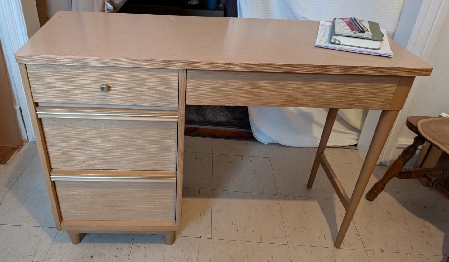 This is a vintage vanity desk with three drawers on the left side. It's made of a light wood laminate material with brass-coloured accents on the drawer fronts. The desk features a simple, functional design. Paint smudge and screw holes on side as shown in photo.
