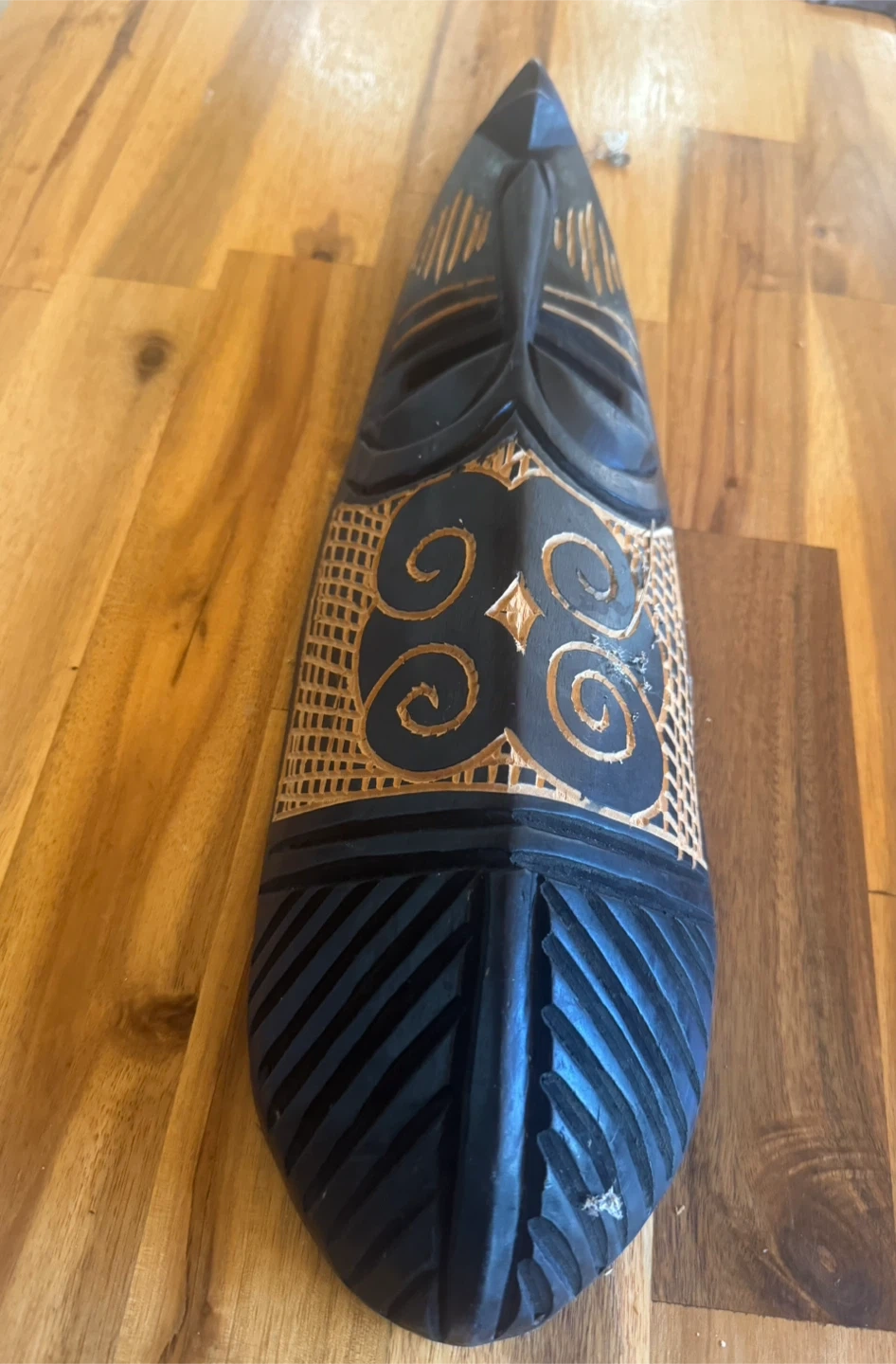 A striking black wooden mask with intricate gold-coloured carvings. It features traditional patterns and a tribal design. This decorative piece would make a great addition to home decor.