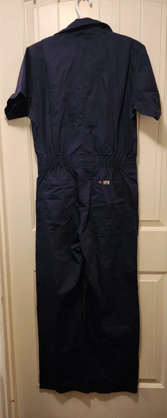 This navy blue short sleeve jumpsuit is built for durability. It features a comfortable fit suitable for a variety of work environments. These coveralls are a practical choice for keeping your clothes clean and protected.