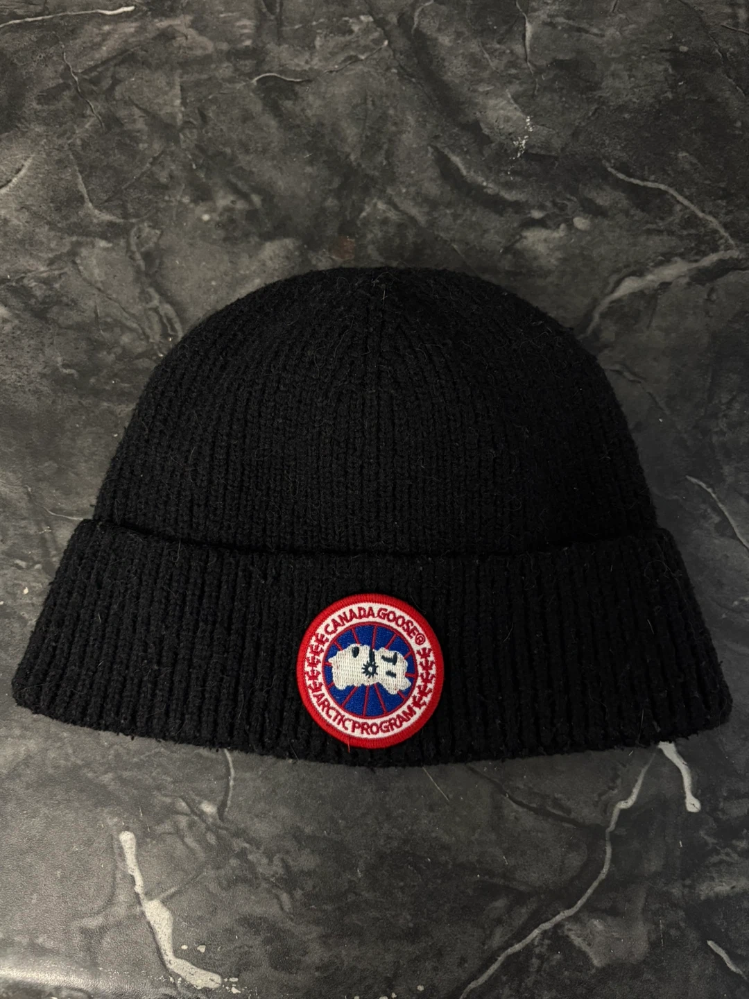 Selling a Canada Goose black knit beanie. It features the iconic Canada Goose Arctic Program logo patch. A great way to keep warm and stylish!