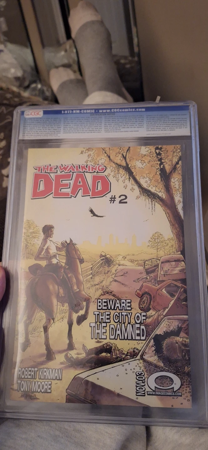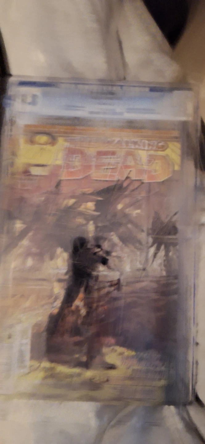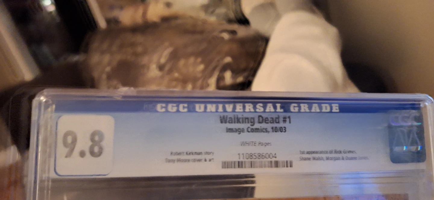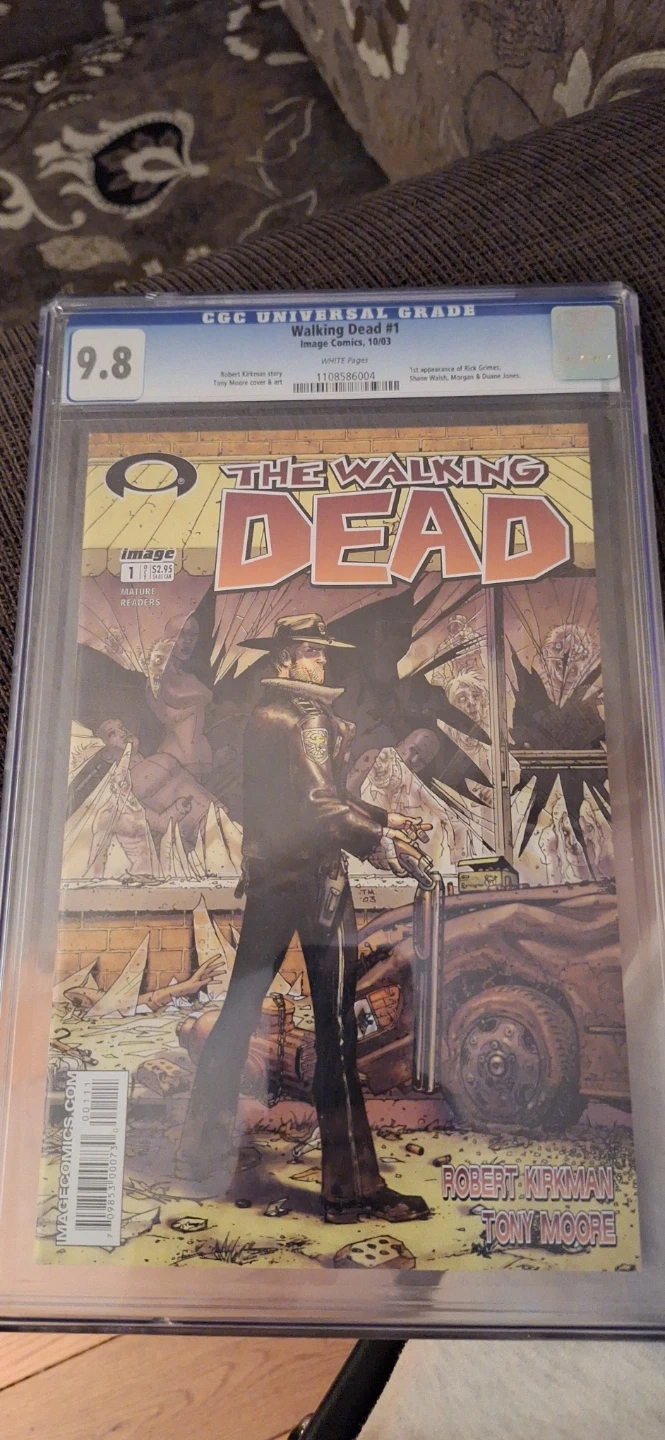 The Walking Dead #1 comic book, graded 9.8 by CGC. This issue features the first appearance of Rick Grimes, Shane Walsh, Morgan & Duane Jones. Published by Image Comics in 10/03.