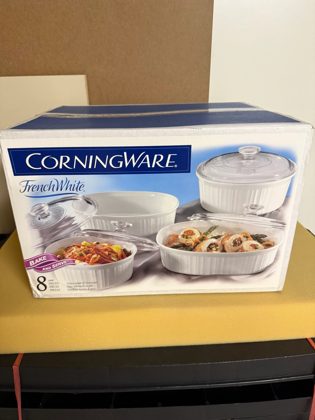 New in box. Eight-piece bake and serve set. Includes various sized dishes and lids. Perfect for meal prep and serving.