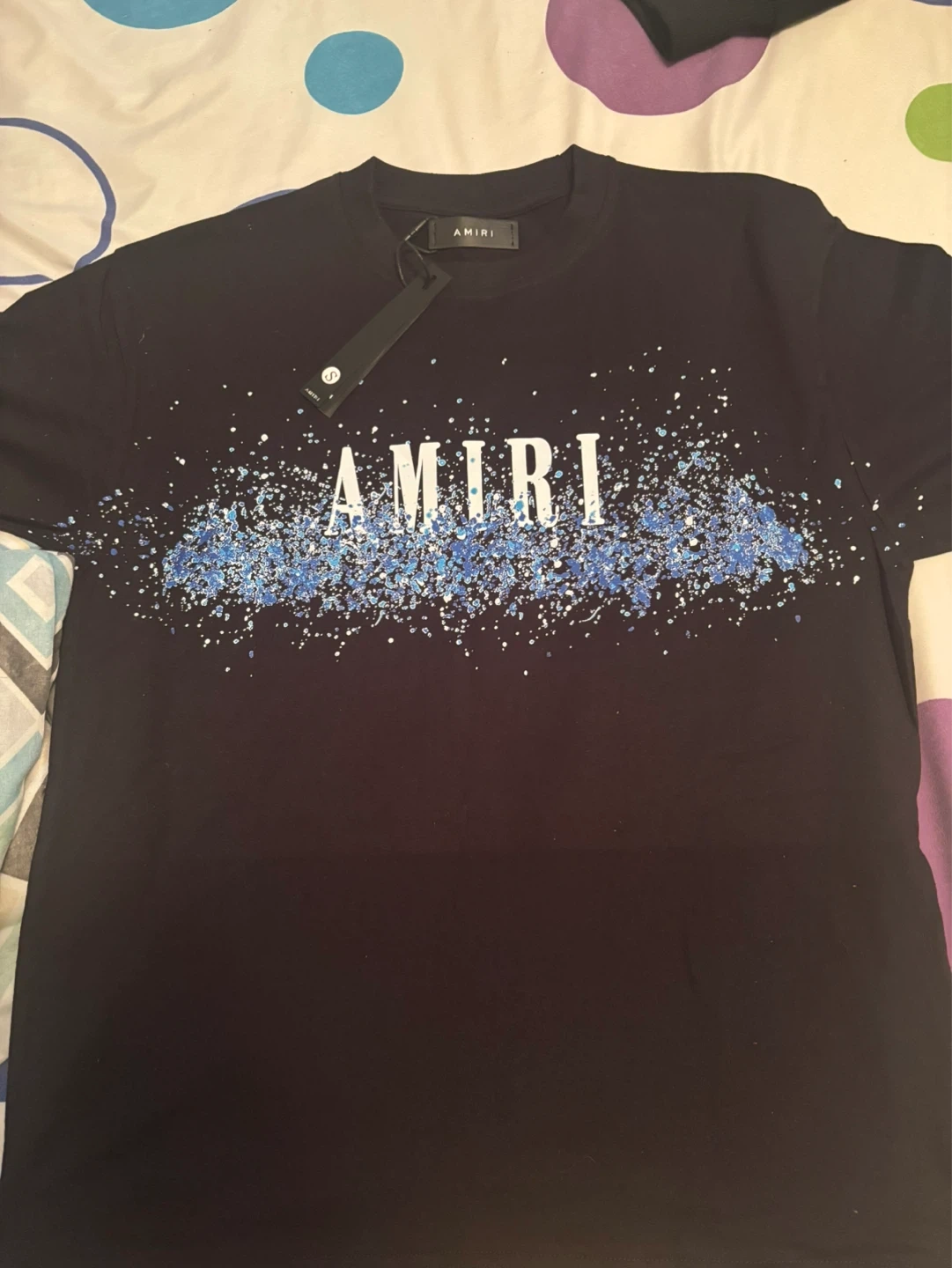 AMIRI short-sleeve t-shirt in black. Features a blue splatter graphic design across the chest and back. Size medium.