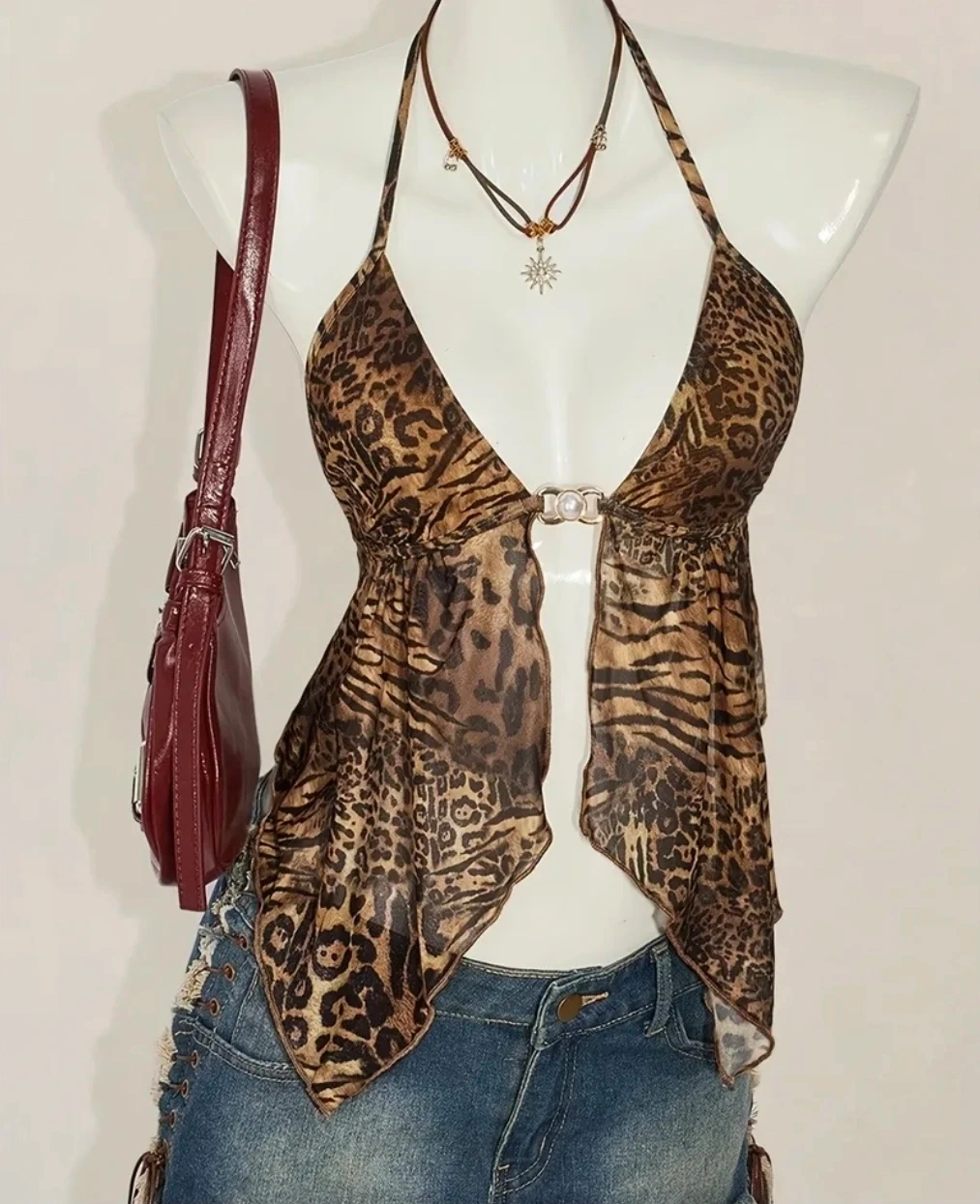 Turn heads with this stunning leopard print halter top, perfect for a bold night out or a trendy festival look. It features a unique mix of animal prints on a lightweight, flowy fabric with a flattering handkerchief hemline. The center front is detailed with a chic faux pearl connector, adding a touch of vintage-inspired glam.
