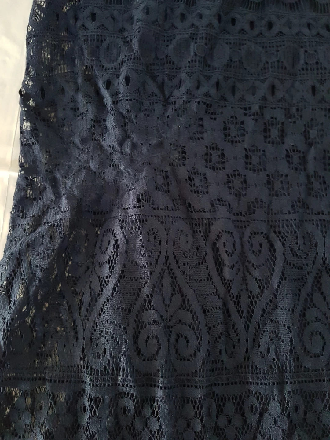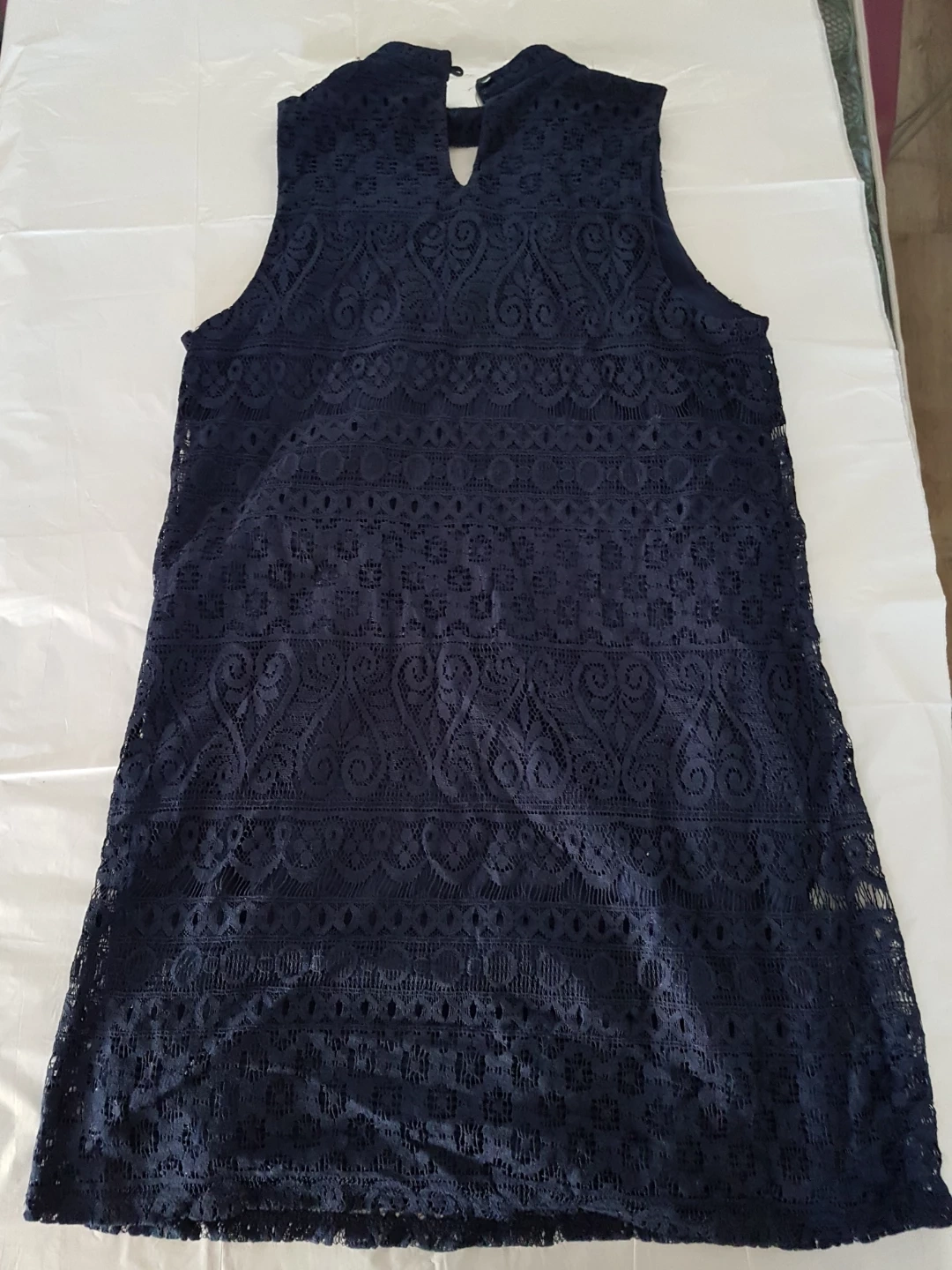 This navy lace dress is from Monteau. It's a size small and sleeveless with a high neckline. The intricate lace pattern makes it a lovely choice for various occasions.