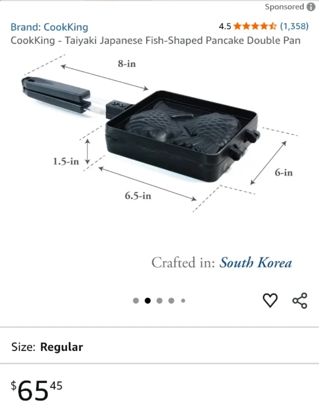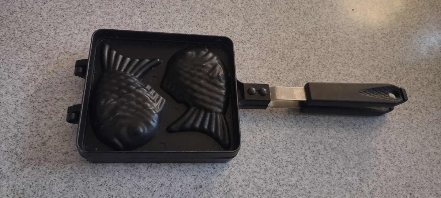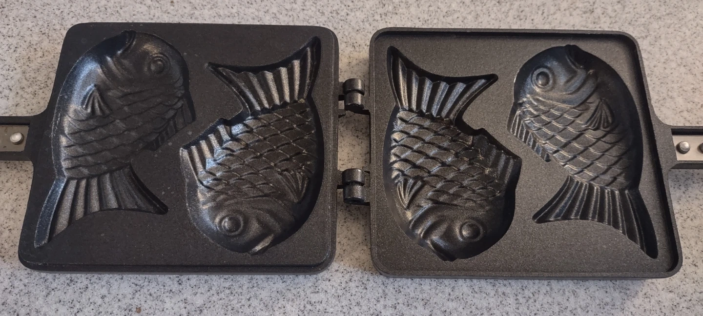 This is a CookKing double pan for making Korean style fish -Shaped pancakes, also known as taiyaki. It's a regular size and made of durable material. Use it to easily create these unique treats at home!