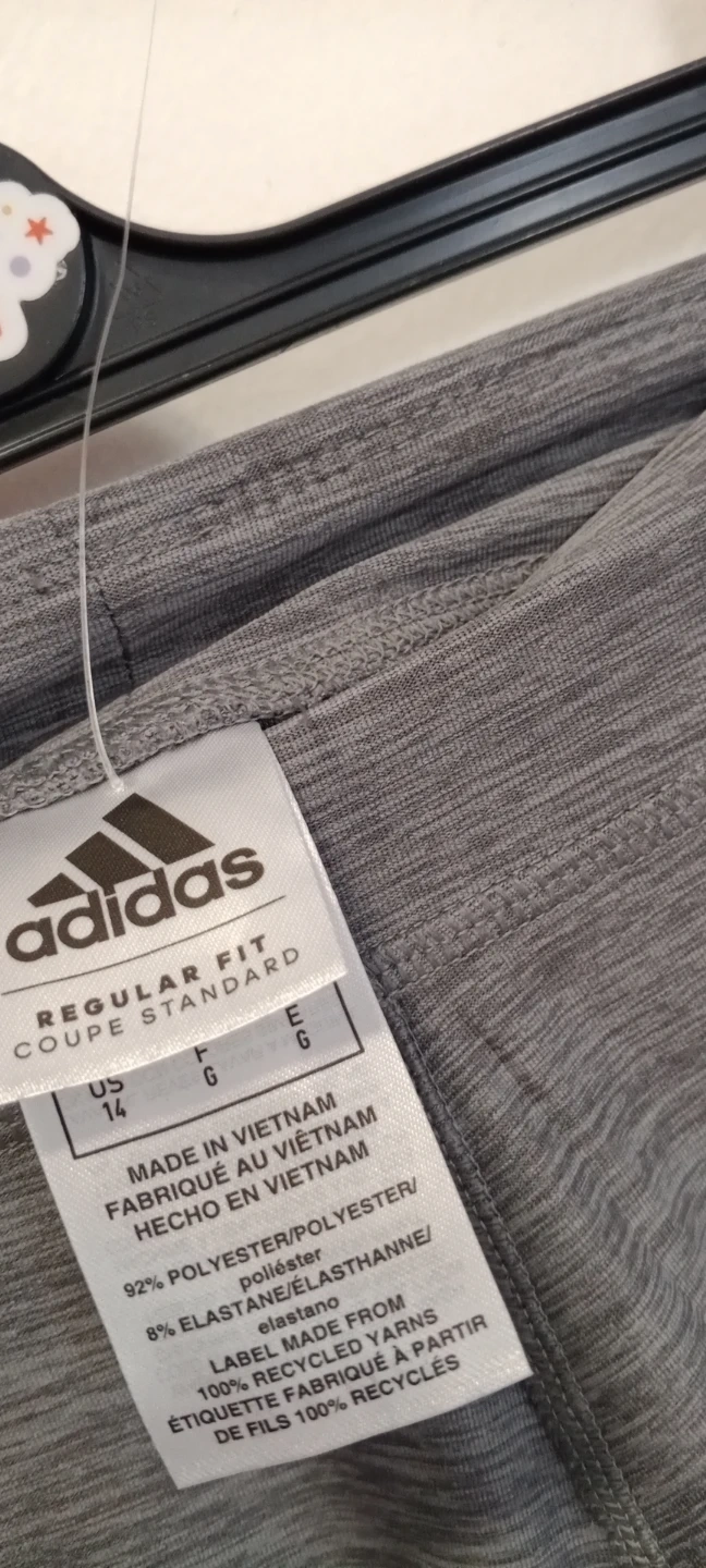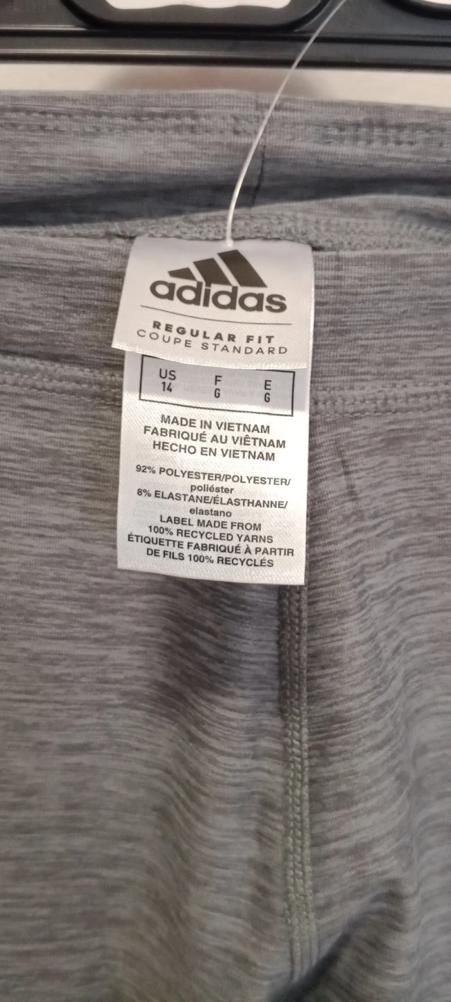 These Adidasare made from a polyester and elastane blend. The fabric is 92% polyester and 8% elastane. They're a regular fit and come in a heathered grey colour. Great for workouts or casual wear!