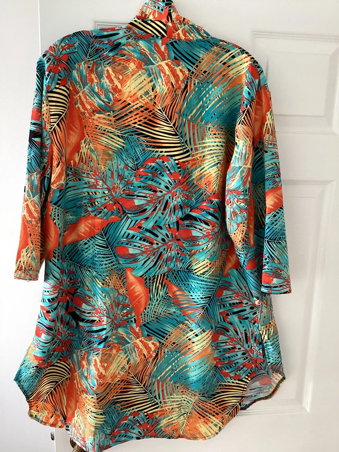 This women's comfortable beautiful swimsuit cover-up features a vibrant tropical print. It's a stylish choice for beach or pool days. Size large.