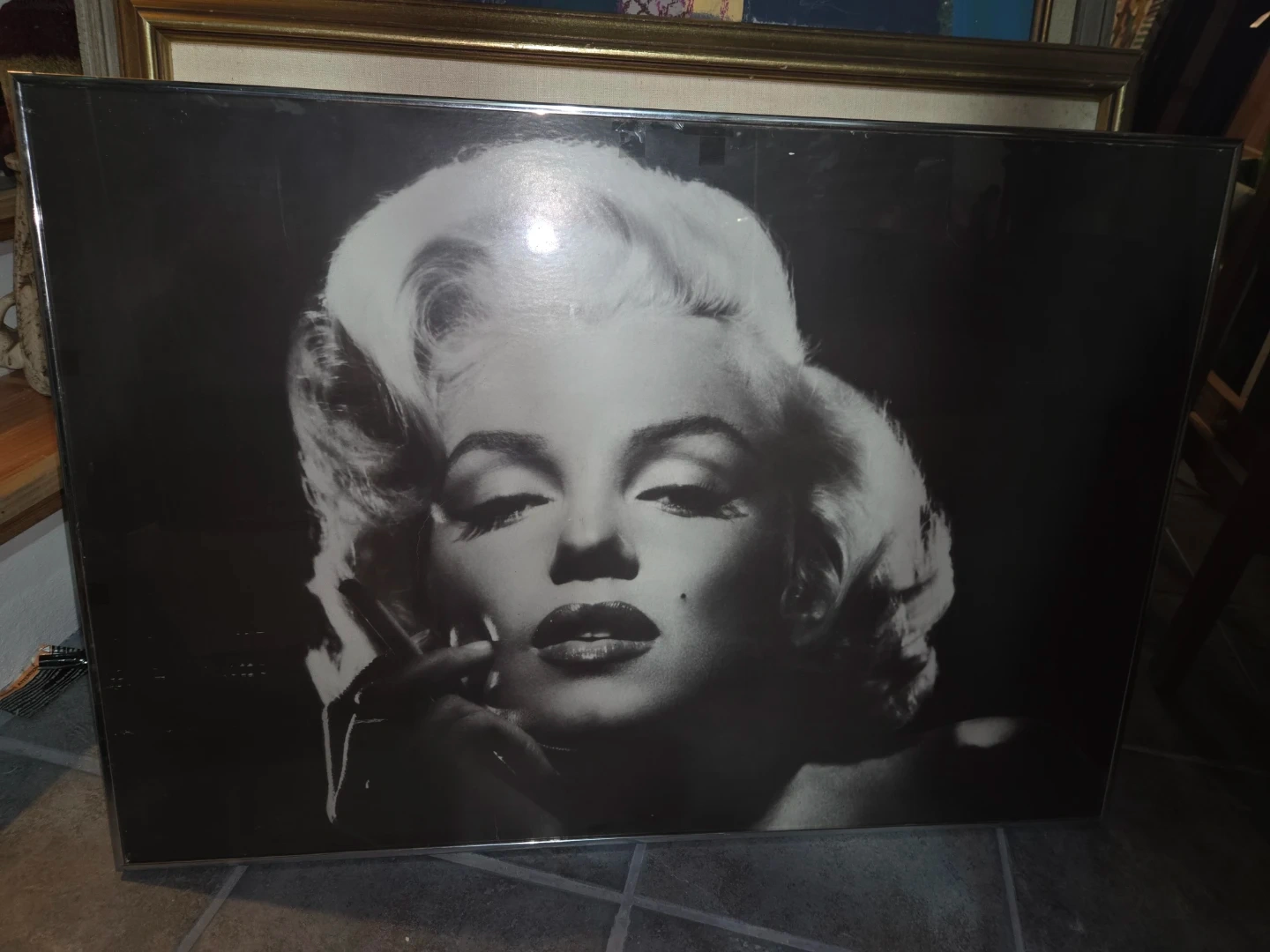 A striking black and white portrait art print featuring Marilyn Monroe. This piece captures her iconic glamour. It's a great addition for any fan or collector of Hollywood memorabilia.