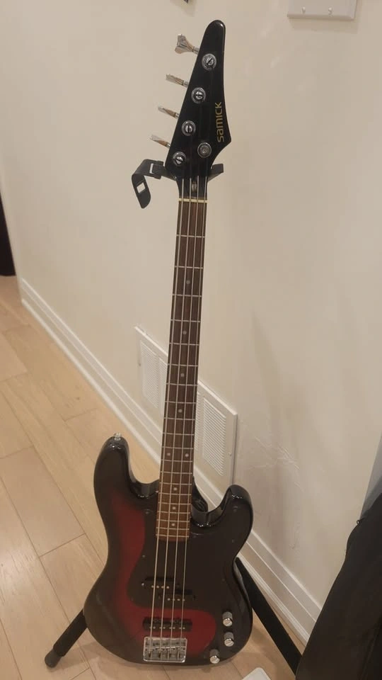 This Samick bass was made in Korea. It has a maple neck, precision + jazz pick-ups, vol/vol/tone controls, and a rosewood fretboard. I will adjust the neck relief and string heights to maximize its playability. All of my guitars have a one-year warranty from me. I have over 200 guitars and basses available. You can see more at https://www.torontoguitar.com/guitars-bass-for-sale. I'm located near Kennedy and Ellesmere in Toronto (M1P 2A1). I can also meet in King City on regular school days. Feel free to message if you have any questions!