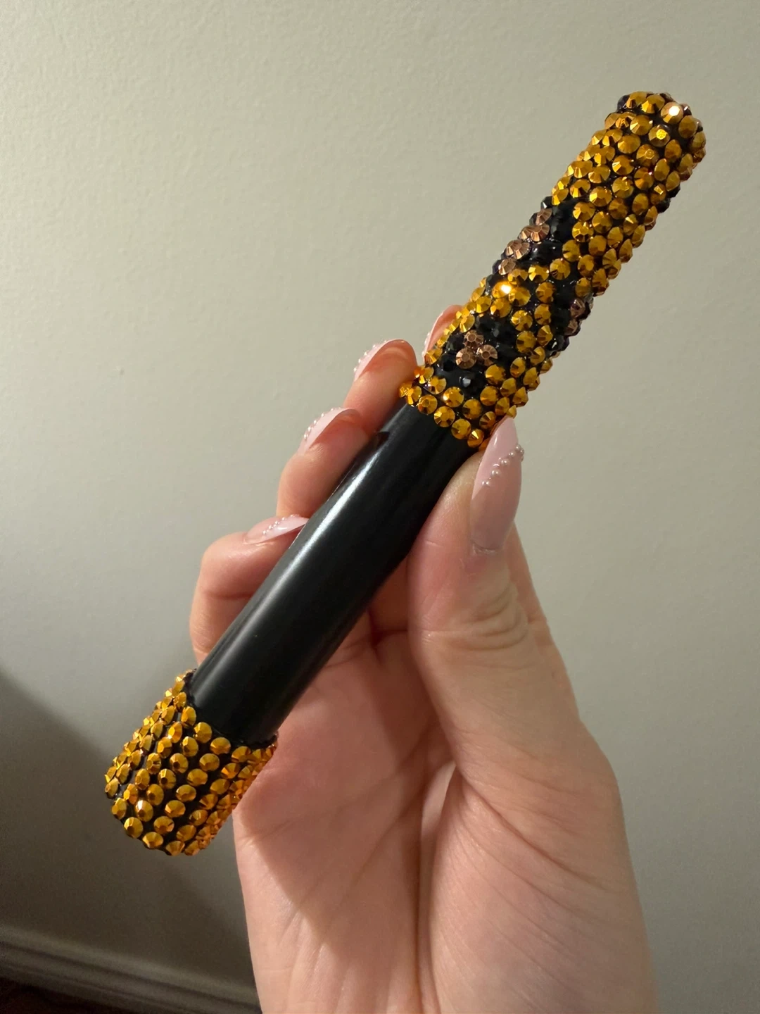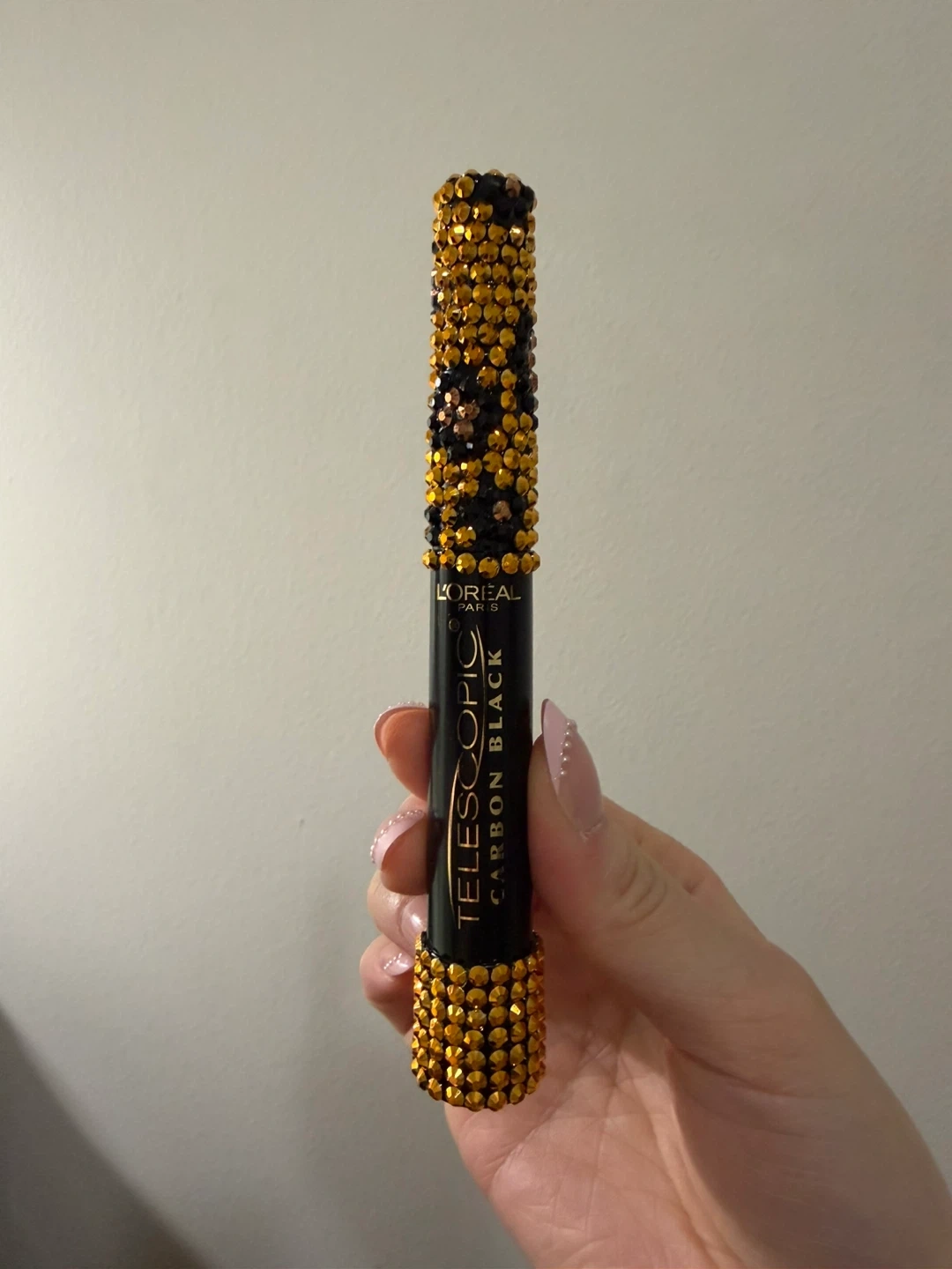 L'Oréal Telescopic Carbon Black mascara customized with bedazzle gems in leopard print