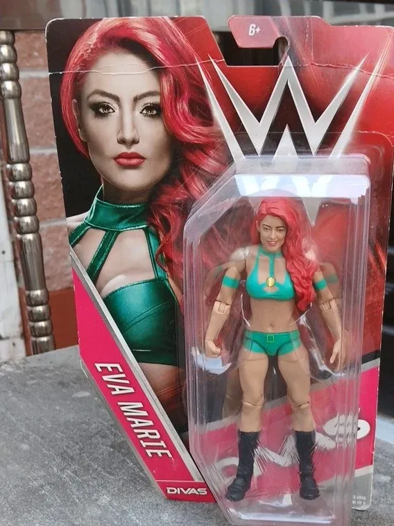 This is a WWE Eva Marie action figure. It's in its original packaging and shows the wrestler in her signature green and teal outfit. Suitable for display or play for fans aged 6 and up.