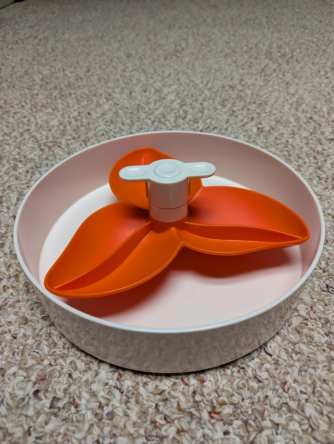 This is a pet water bowl designed to prevent spills. It features a floating disk that slows down drinking. Made of durable plastic material. Easy to clean.