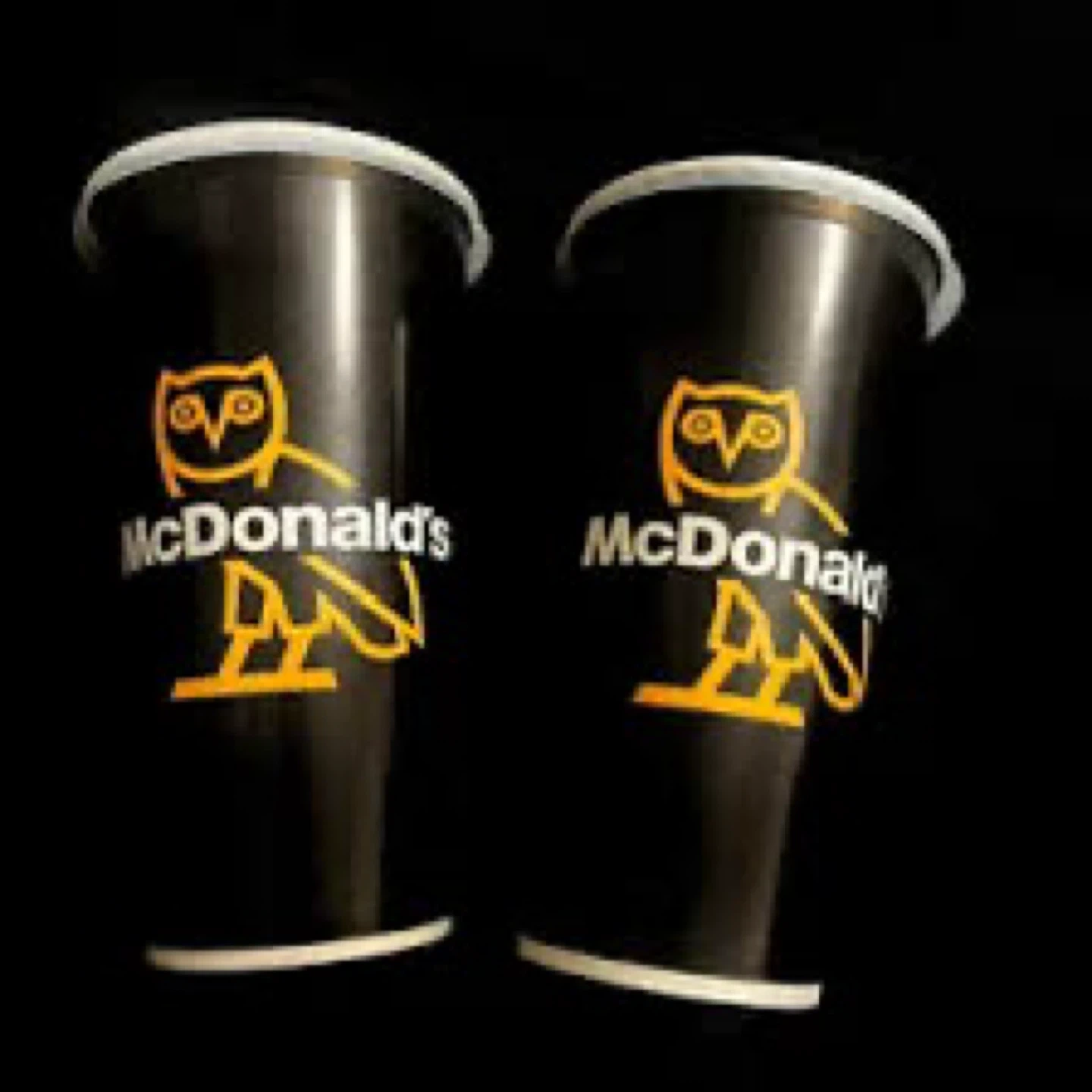 4 black paper cups with McDonald's and OVO owl branding. These collectible cups are perfect for fans of both brands. Great for display or use!