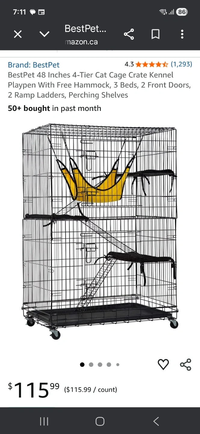This BestPet 48-inch cat cage is a 4-tier wire kennel. It includes a free hammock, three beds, two ramp ladders, and perching shelves. It's great for providing your feline friends with a safe and stimulating environment.