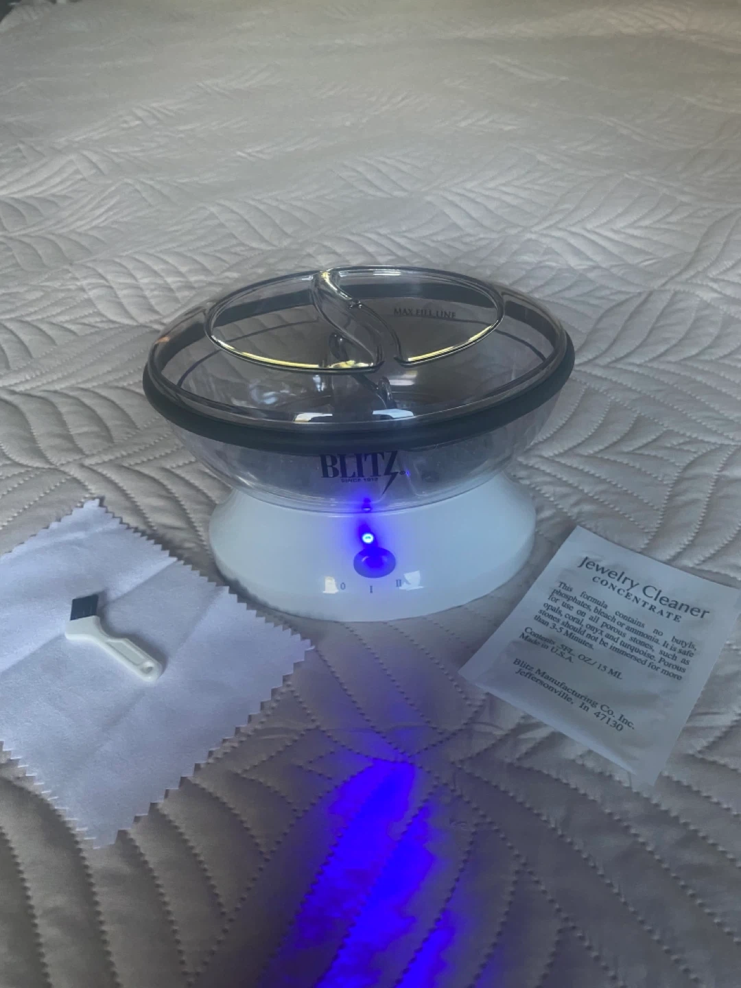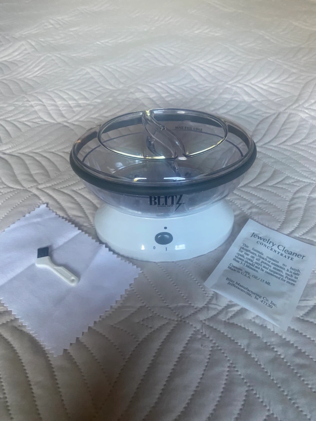 Selling a Blitz Ultra Jewelry Cleaning Machine! It cleans, shines, and protects your jewelry. Included is the jewelry cleaner concentrate and a microfiber cloth. It also has an angled jewelry brush for intricate cleaning.
