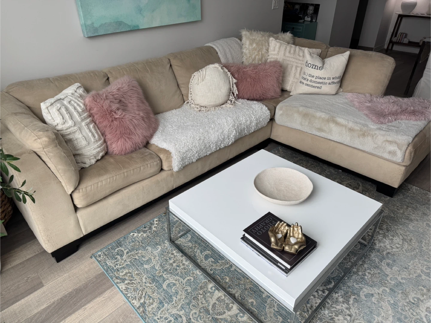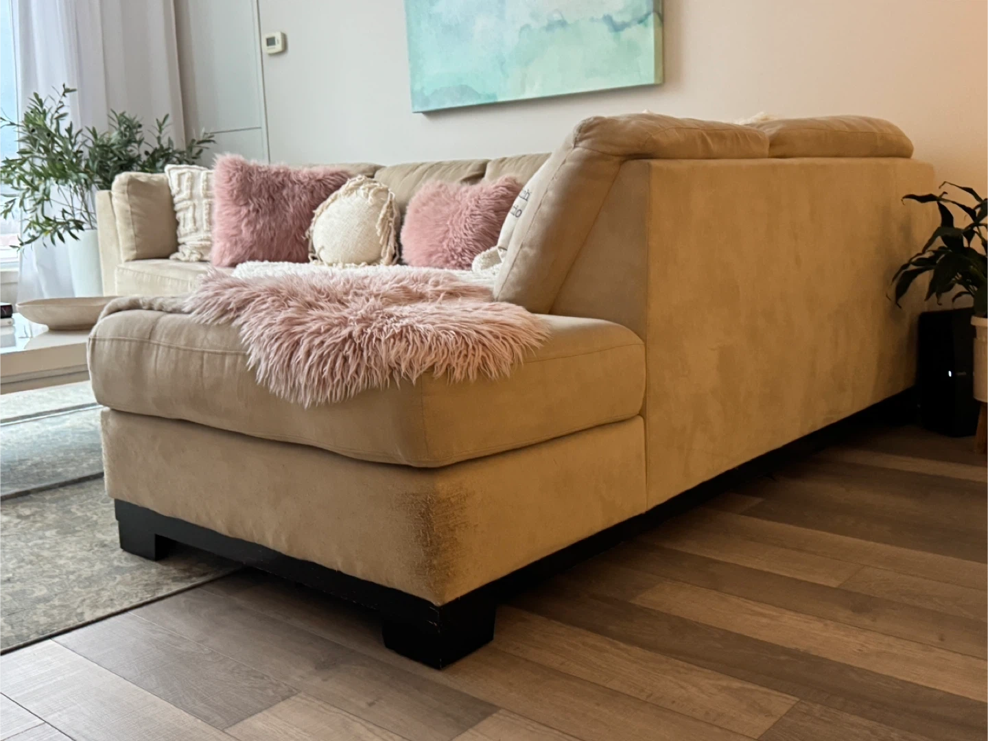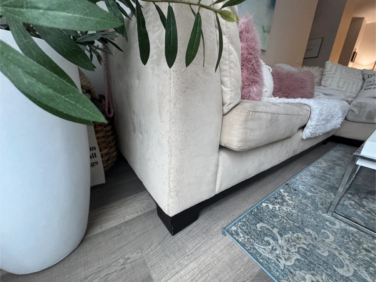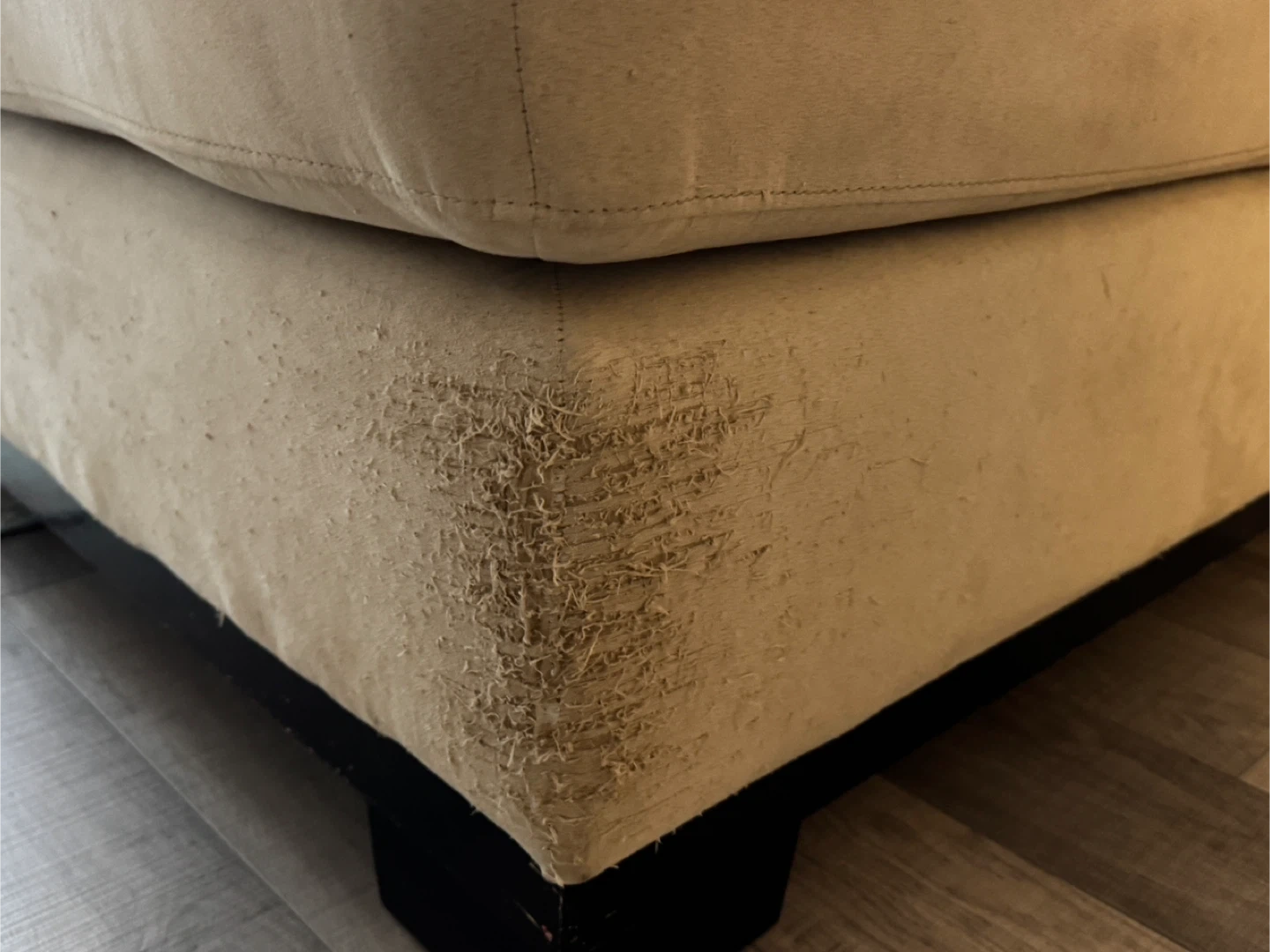 It's made of a soft fabric material. The sofa has some wear on the corner, as shown in the photos and watermarks.