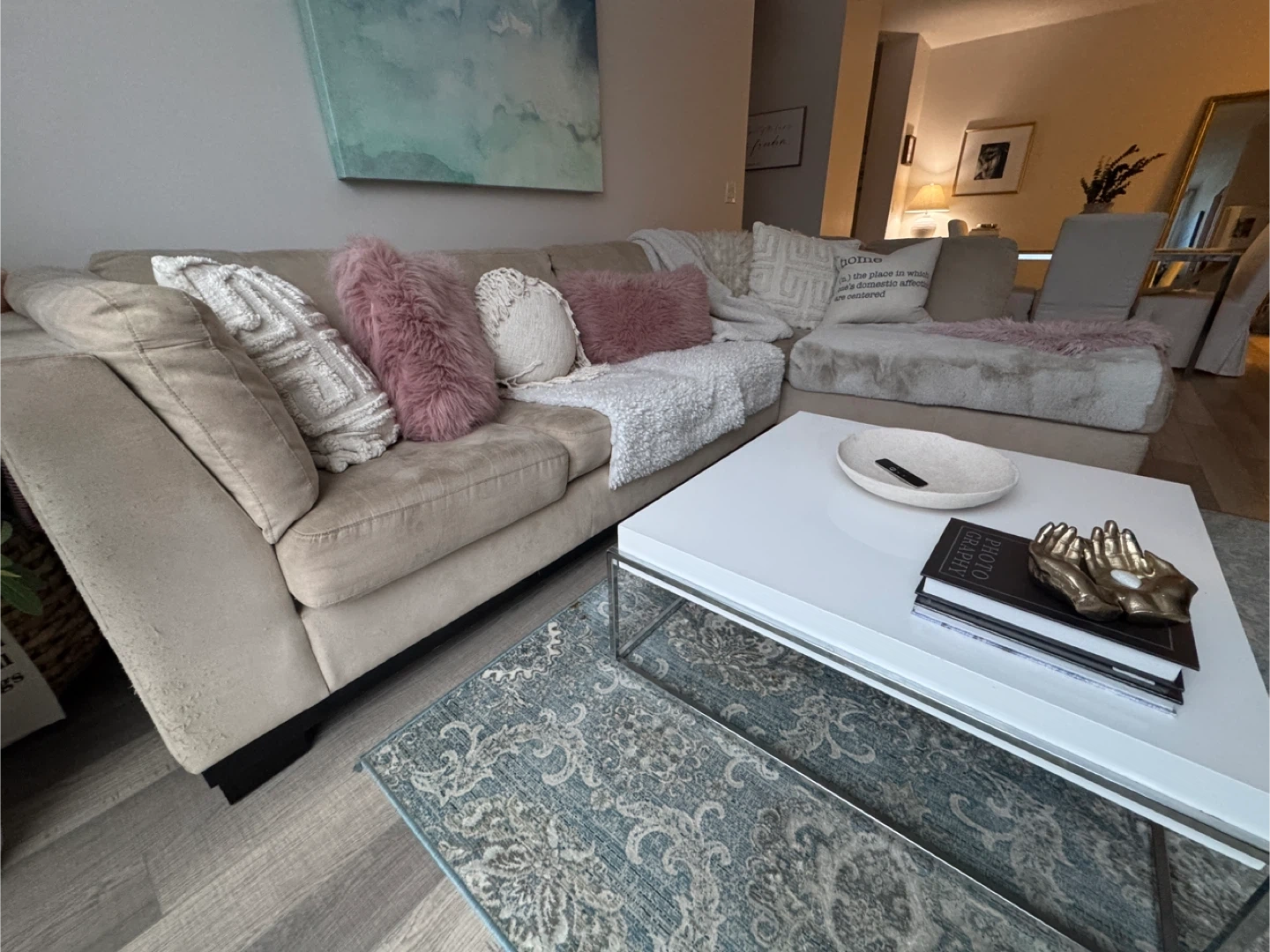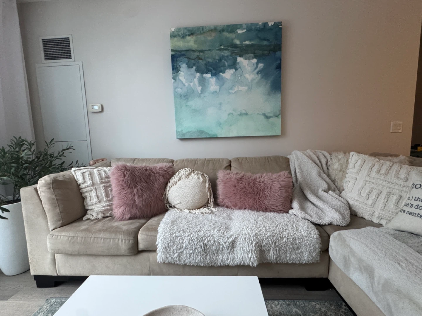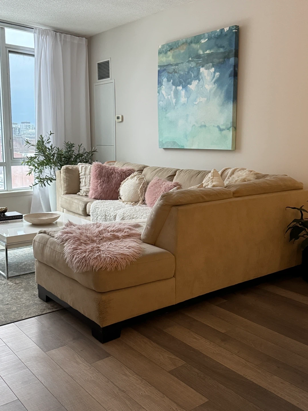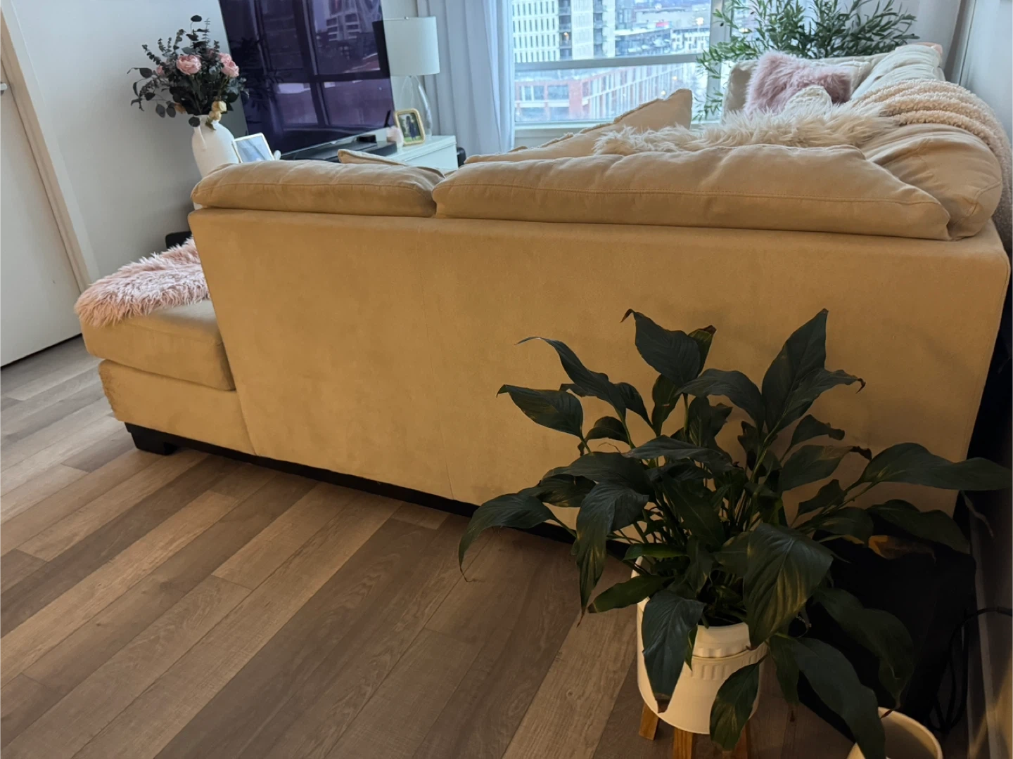 It's made of a soft fabric material. The sofa has some wear on the corner, as shown in the photos and watermarks.