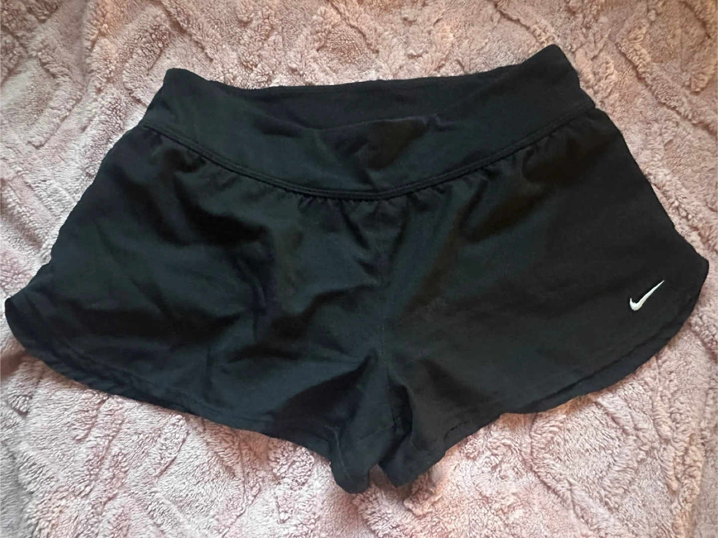 Black Nike running shorts with a small white swoosh logo on the right leg. Elastic waistband for a comfortable fit. Lightweight and breathable material.