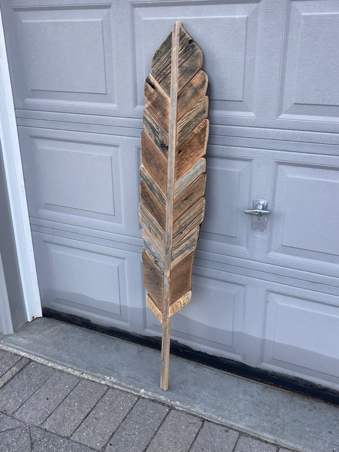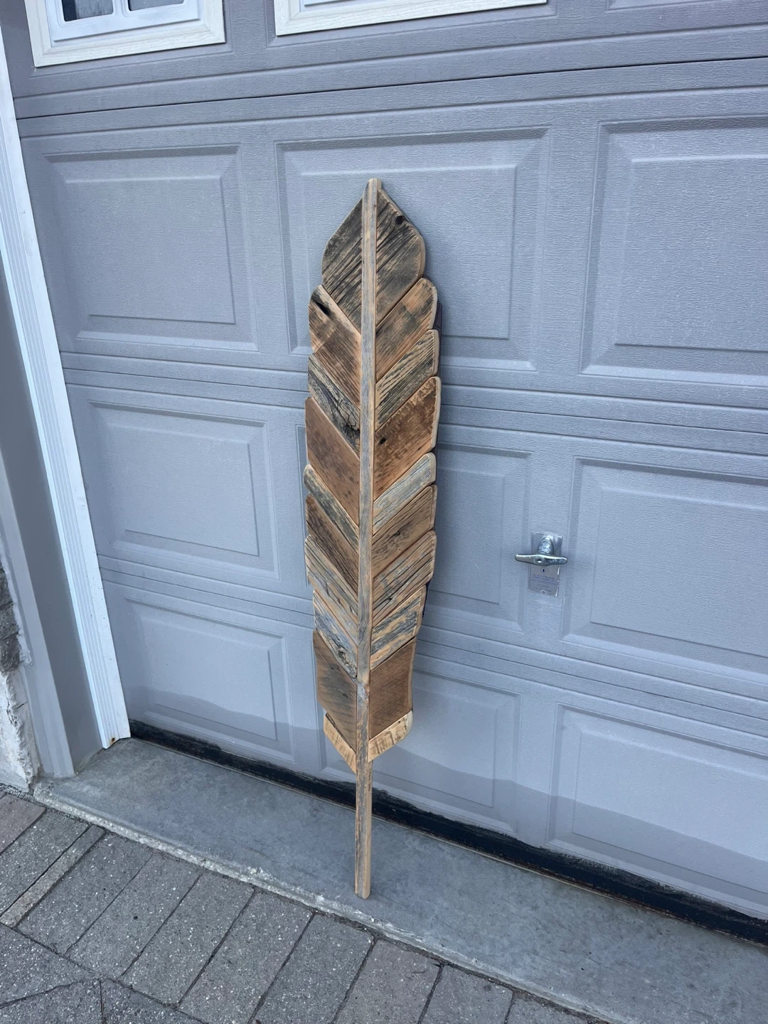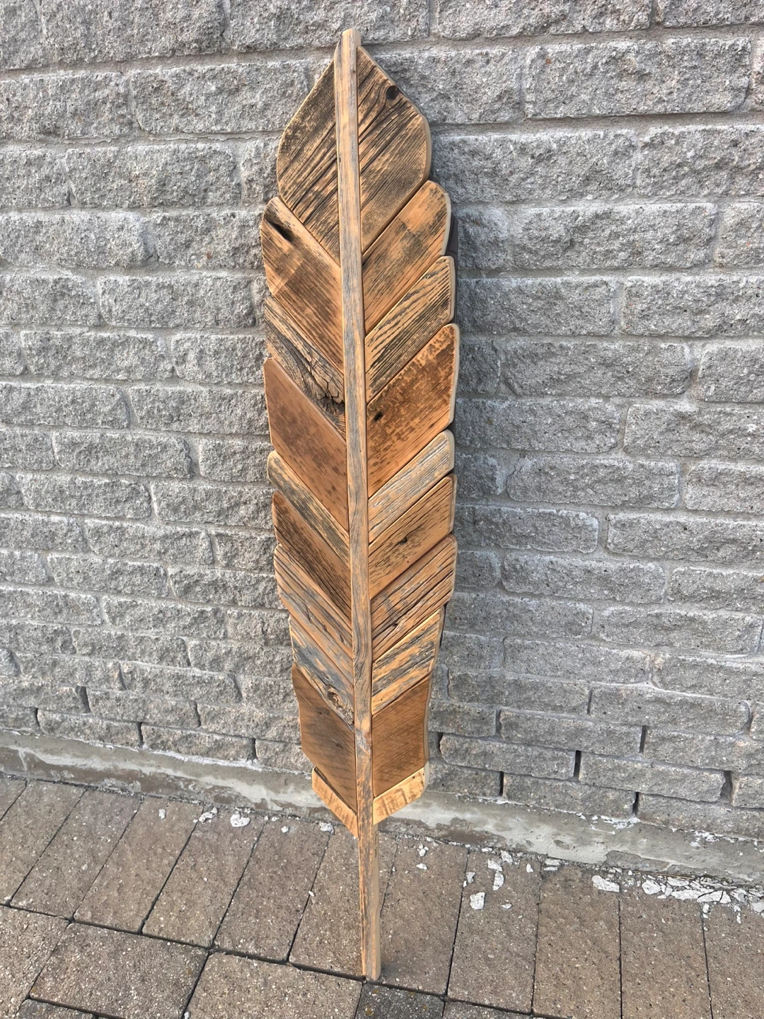 Handcrafted Barn Board Feather. All made from locally sourced reclaimed barn boards. Great for home or cottage. Awesome conversation piece. Can be hung inside or outside. I’m a local artist located in Thornton Ontario. Size is 4 feet 10.5 inches tall by 11 inches wide. Have 2 available. Can deliver within reasonable distance.