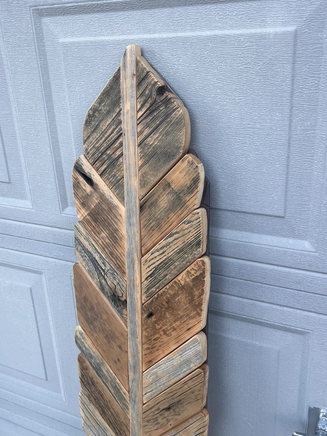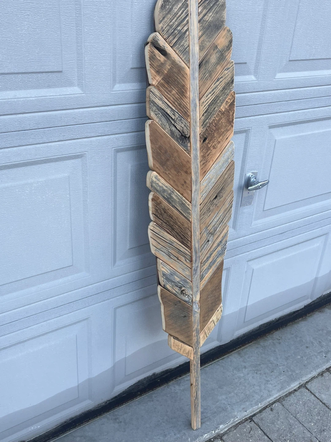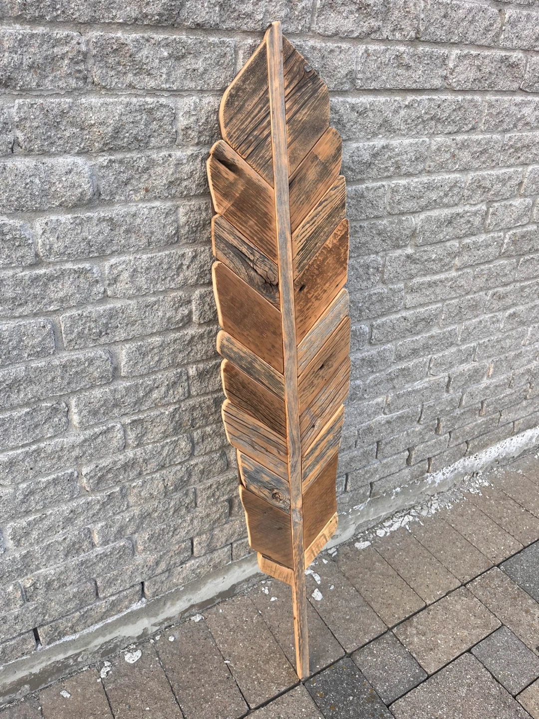 Handcrafted Barn Board Feather. All made from locally sourced reclaimed barn boards. Great for home or cottage. Awesome conversation piece. Can be hung inside or outside. I’m a local artist located in Thornton Ontario. Size is 4 feet 10.5 inches tall by 11 inches wide. Have 2 available. Can deliver within reasonable distance.