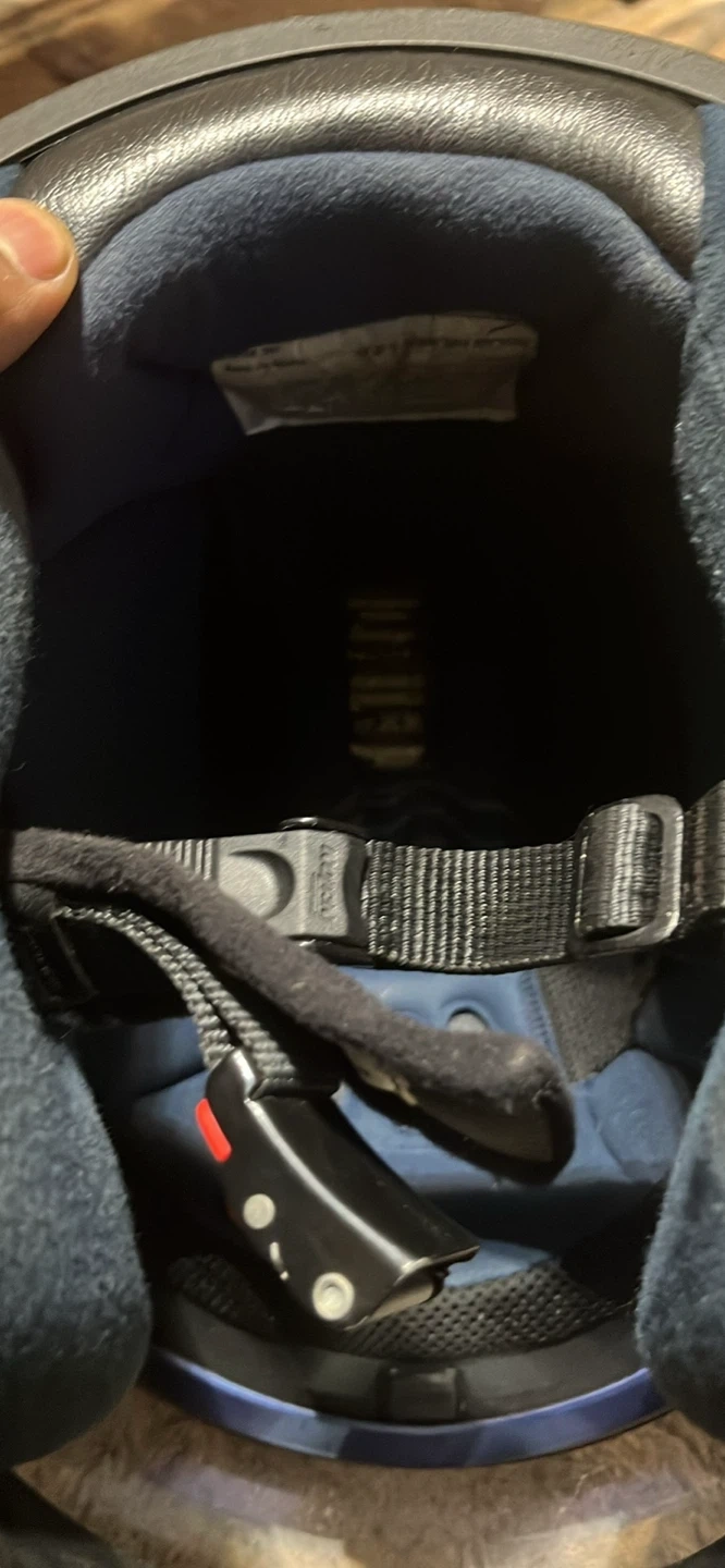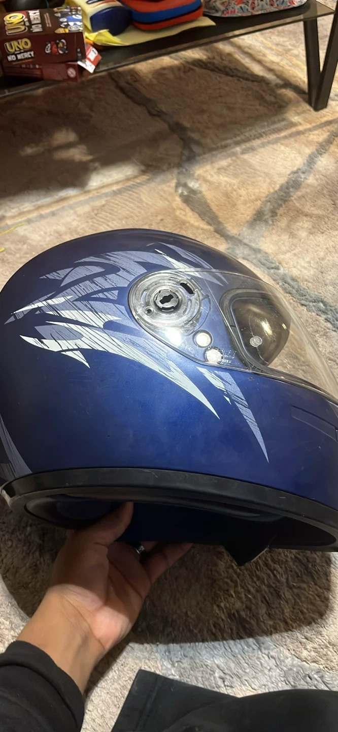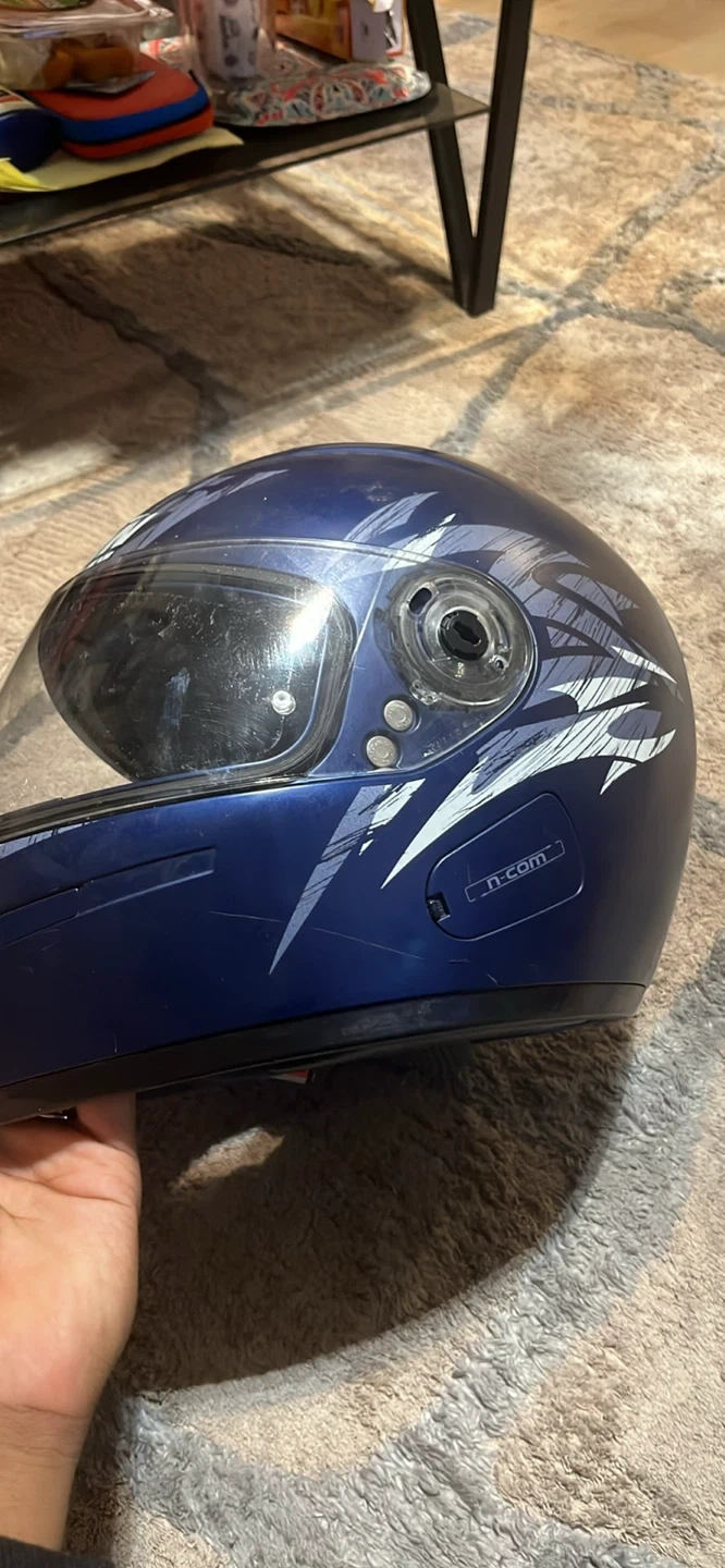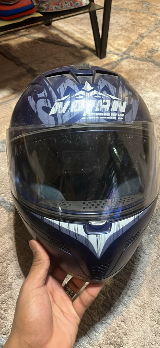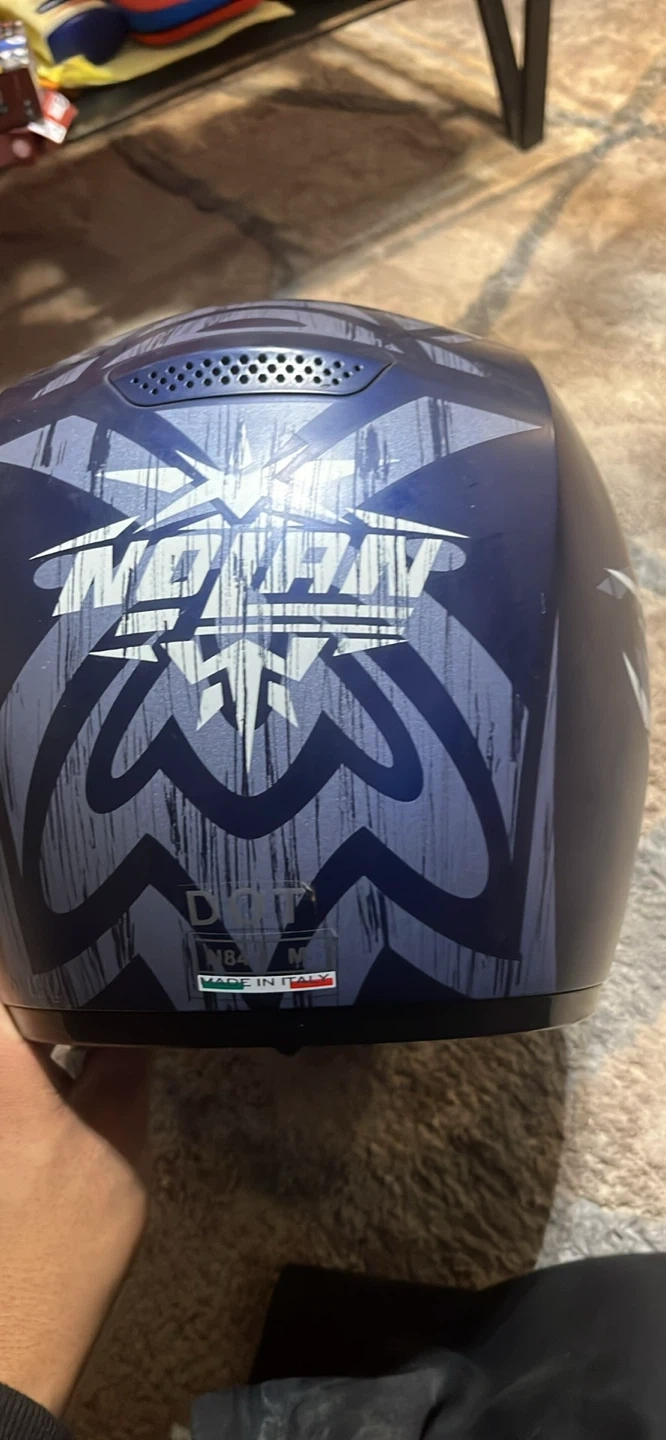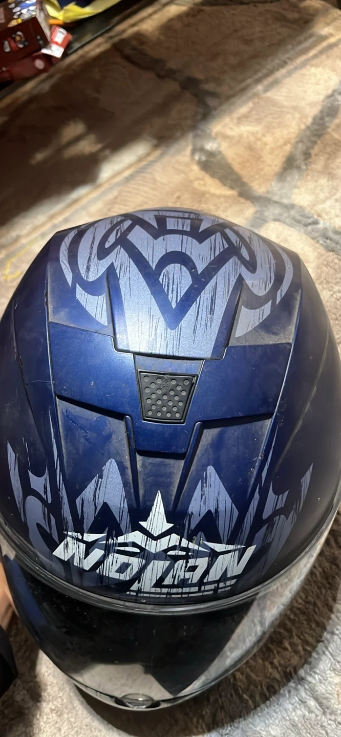 This is a blue Nolan full face motorcycle helmet. It's made in Italy. Great for protecting your head while riding!