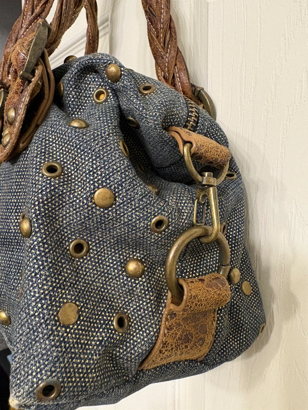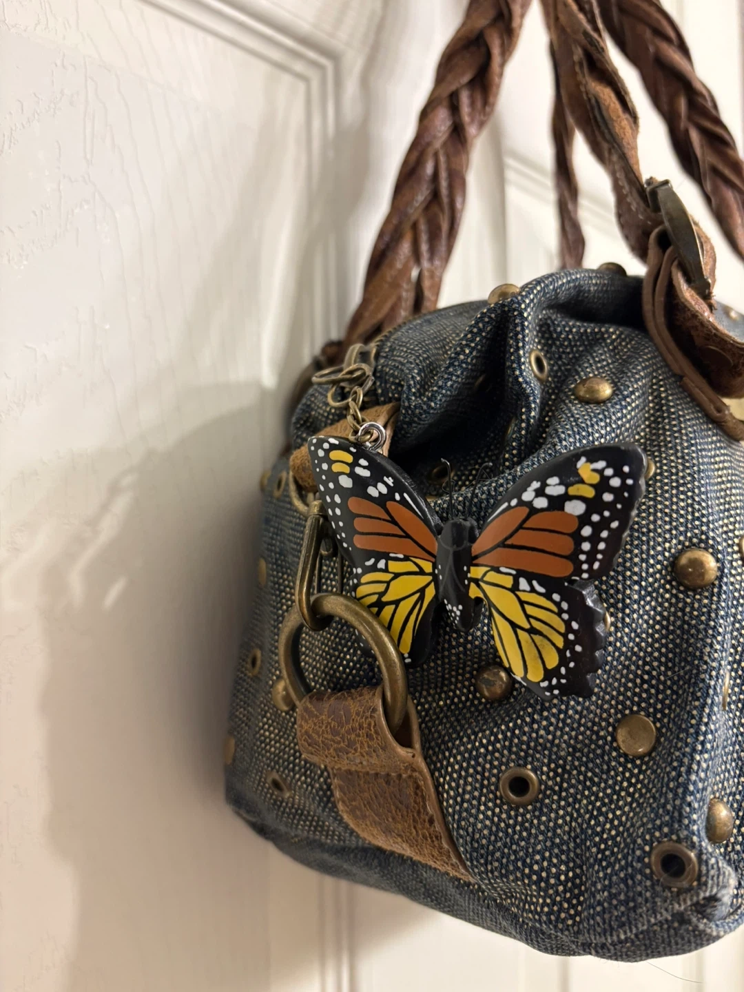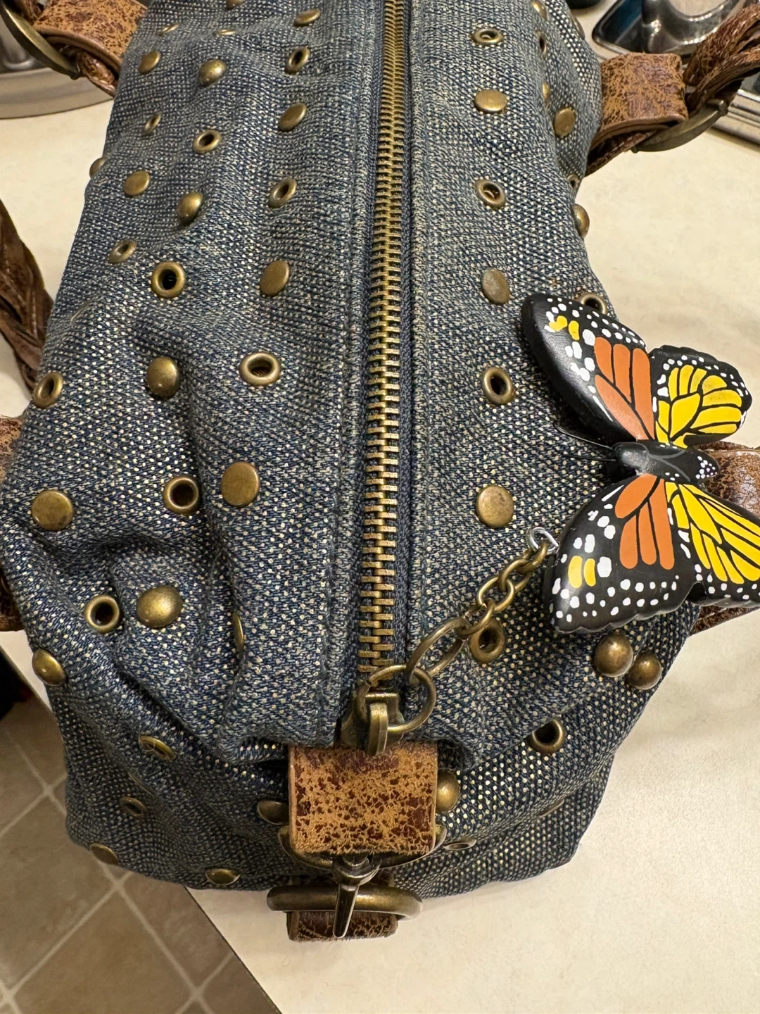 This Red by Marc Ecko handbag features a stylish studded denim exterior with distressed brown leather accents and braided straps. It includes a fun butterfly charm. It's a unique accessory! Great condition, just like new! Pick up in Chestermere.