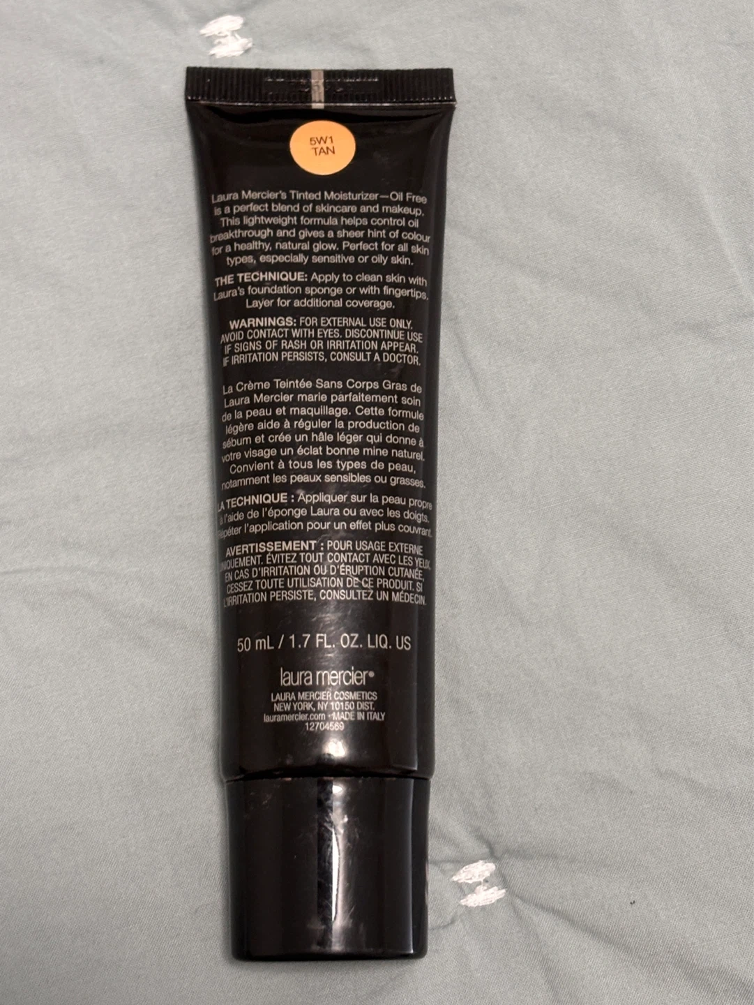 Laura Mercier Tinted Moisturizer Oil Free in shade 5W1 Tan. This lightweight formula helps control oil breakthrough and gives a sheer hint of colour for a healthy, natural glow. Suitable for oily or sensitive skin types.