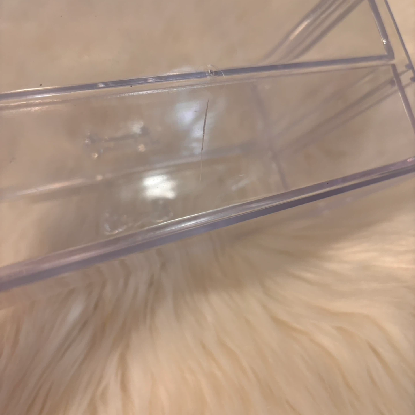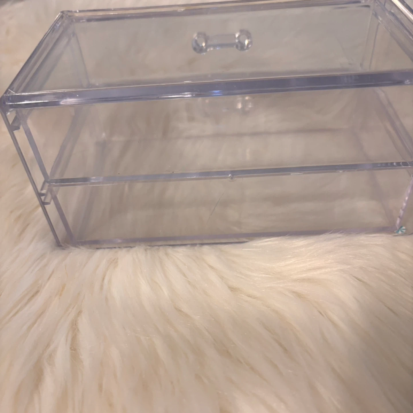 This is a clear acrylic organizer with two drawers. It's great for storing small makeup items or accessories. The clear design makes it easy to see what's inside!