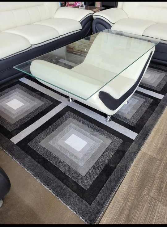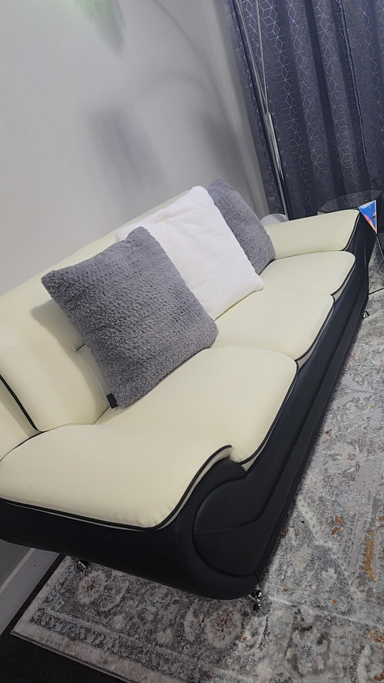 Selling a modern sofa set with a cream and black colour scheme. It features a unique design with curved accents. The set includes a sofa, loveseat, coffee table and armchair. The sofa has a sleek, contemporary look that would fit well in any living room. Great condition!