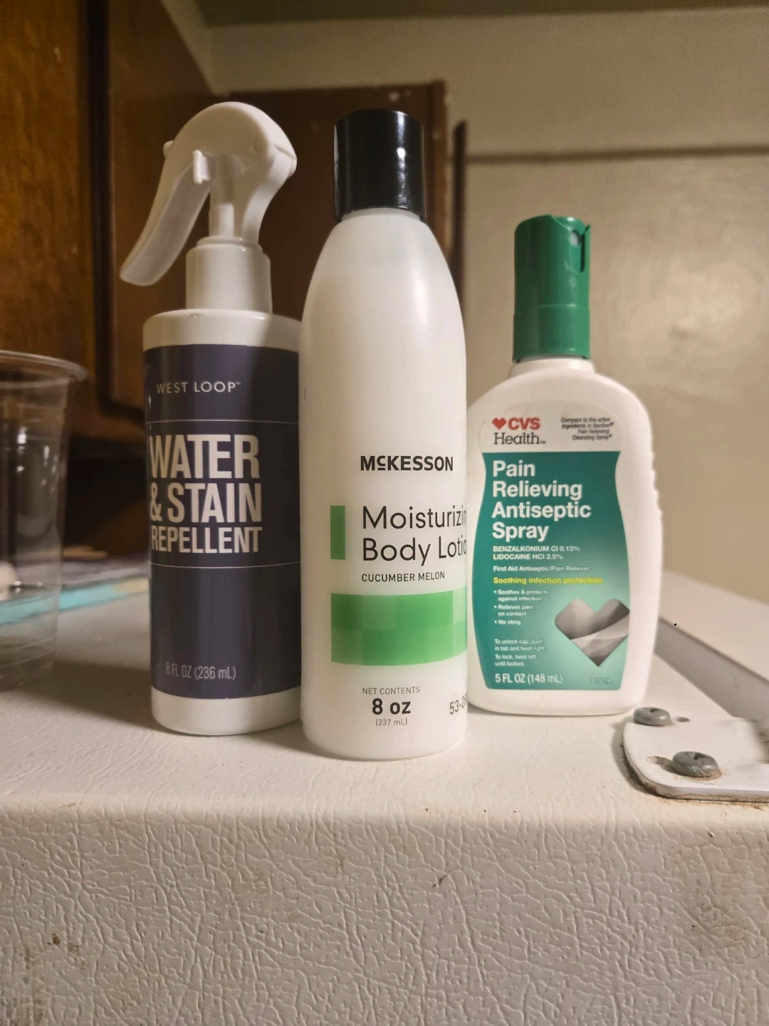 McKesson Moisturizing Body Lotion in Cucumber Melon scent. Net contents 8 oz (237 mL). West Loop Water & Stain Repellent 8 fl oz (236 mL). CVS Health Pain Relieving Antiseptic Spray 5 fl oz (148 mL).