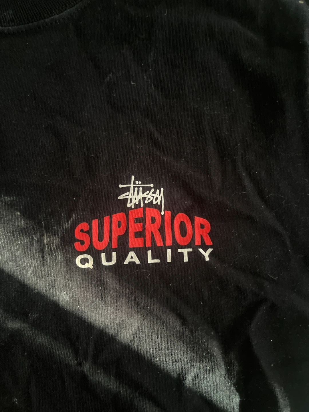 Black Stüssy t-shirt with 'Superior Quality' graphic. Made in Honduras. Size S.
