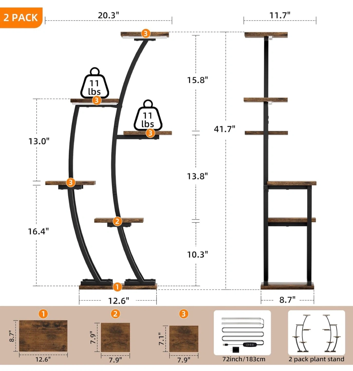 This is a 2-pack set of indoor plant stands. Each stand features a curved metal frame with wood-look shelves. Includes LED grow lights for your plants. Brand new in the box
