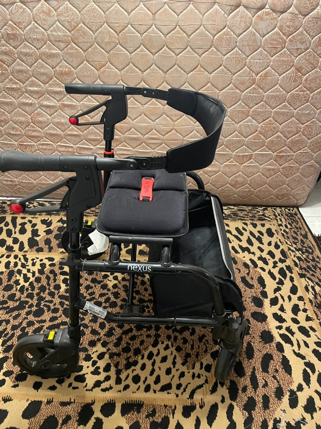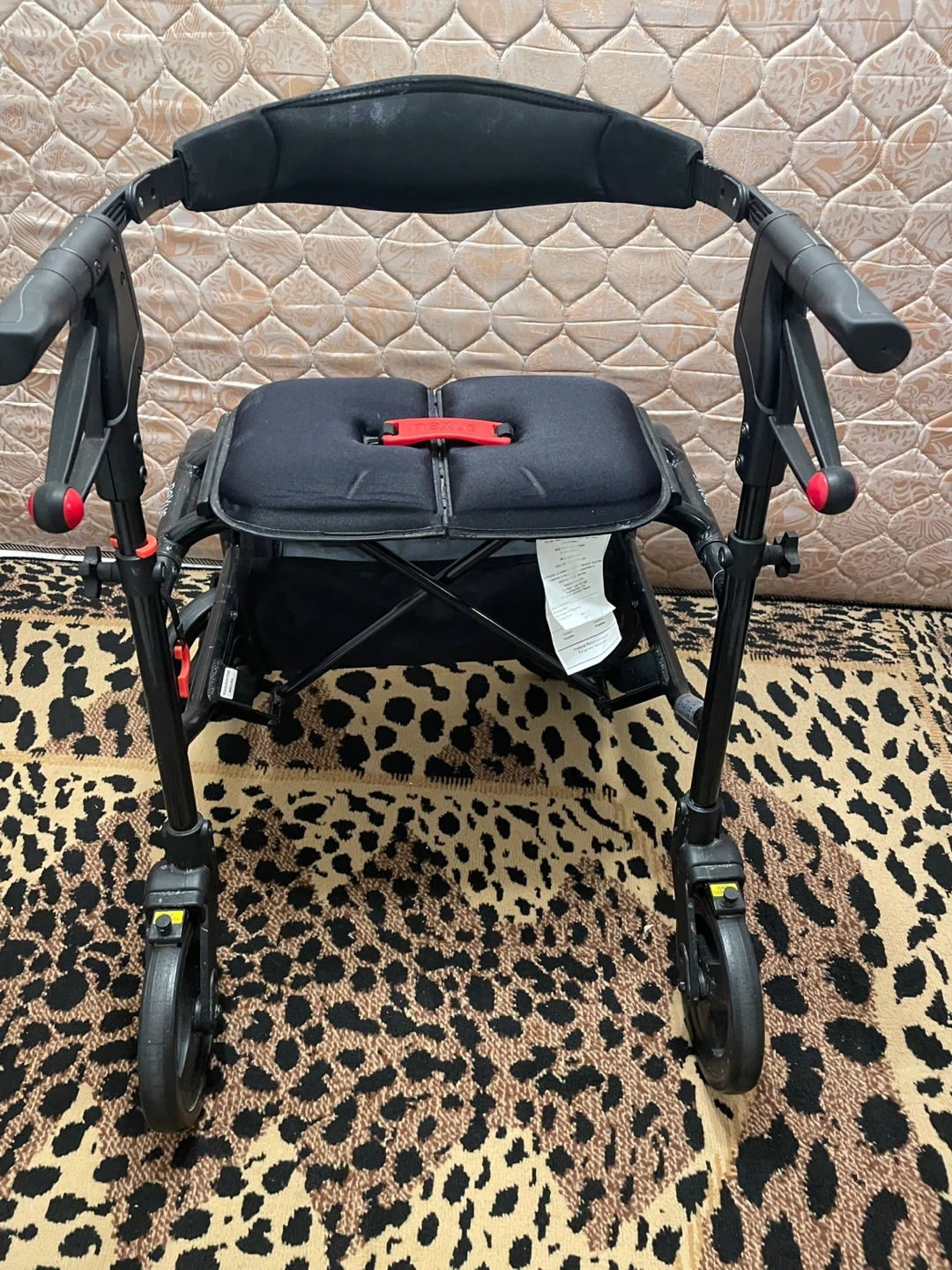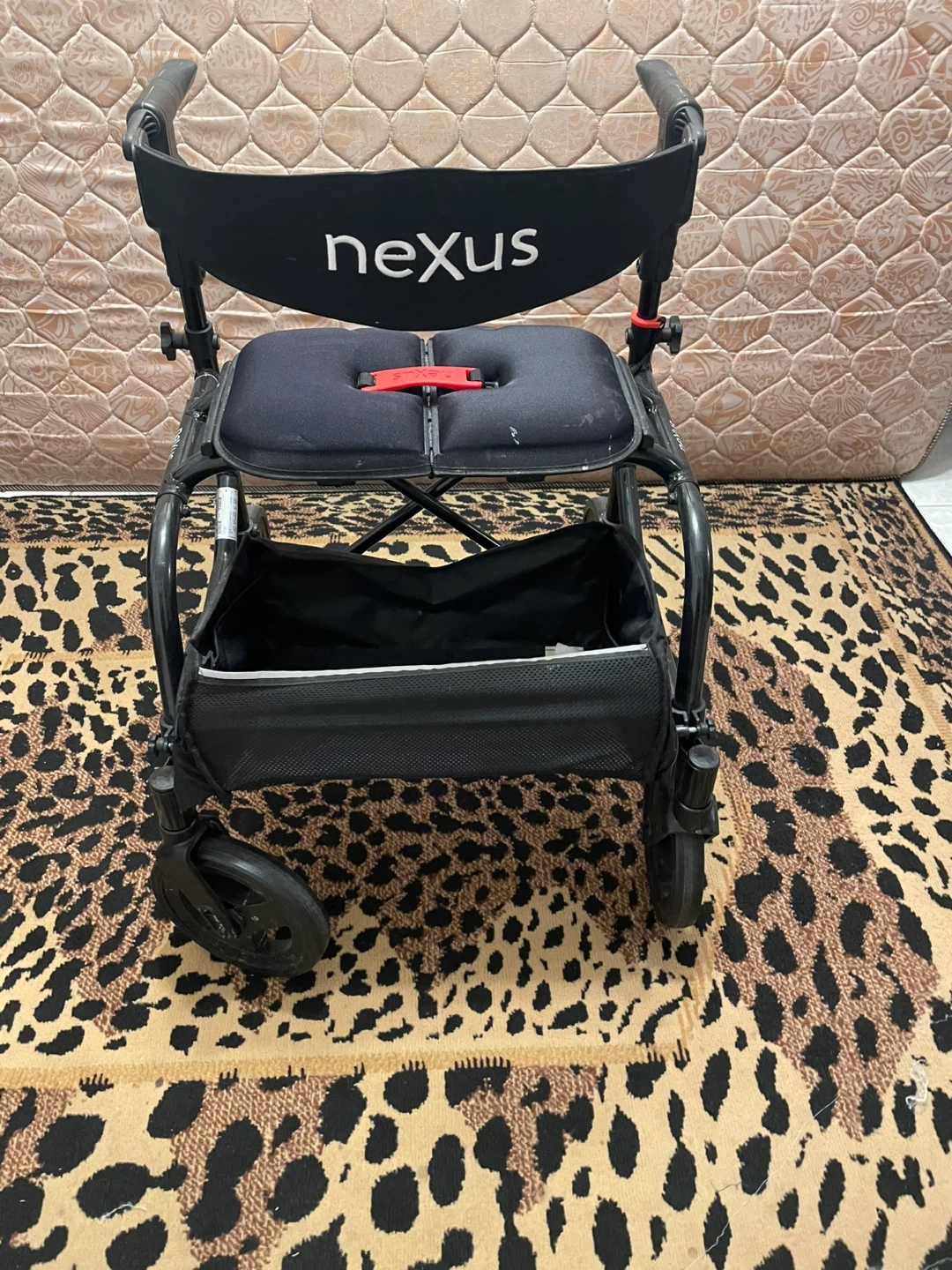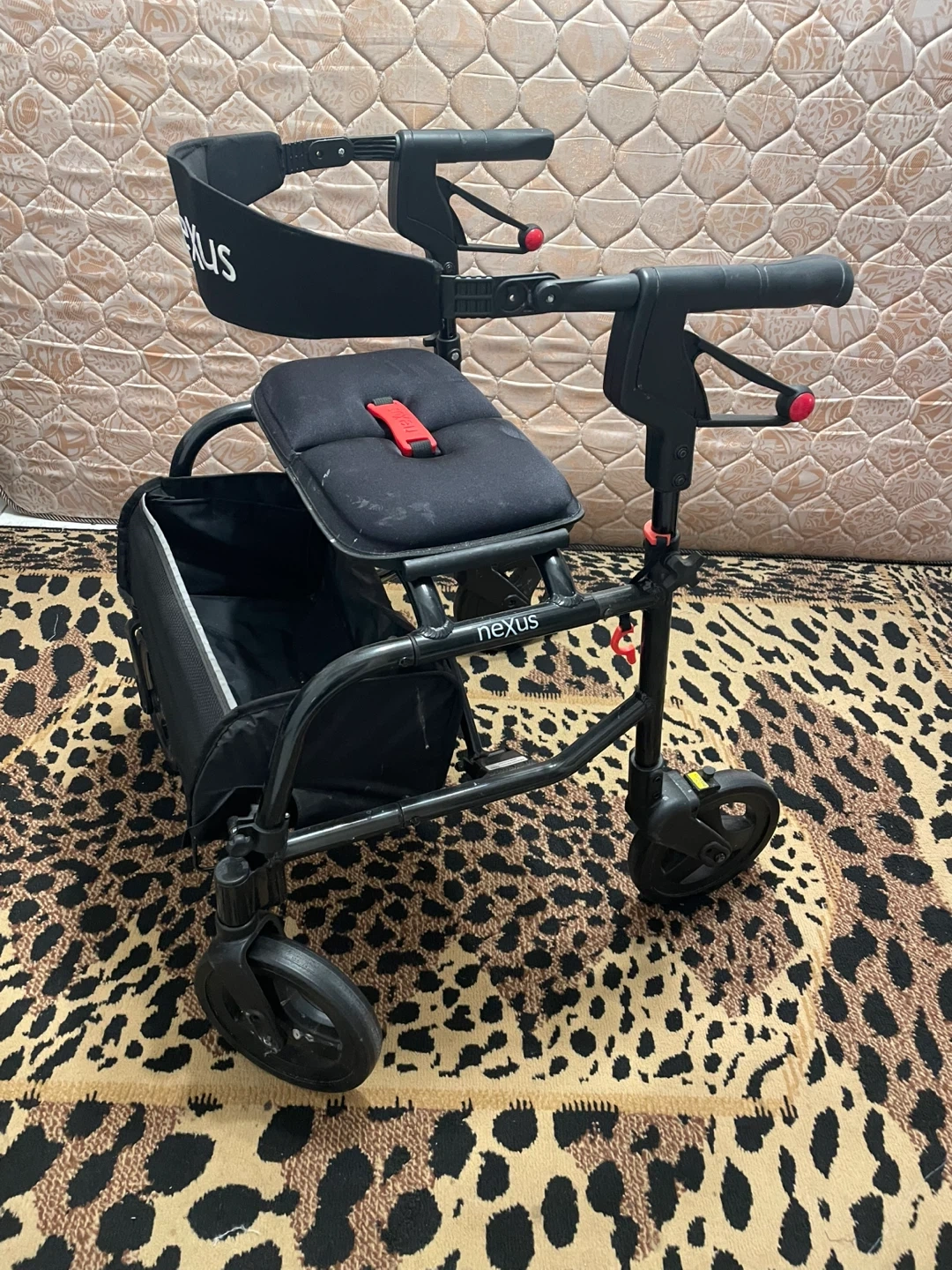 This black Nexus walker features a seat and a storage bag. It's designed for mobility assistance. Adjustable handles ensure a comfortable grip for users.