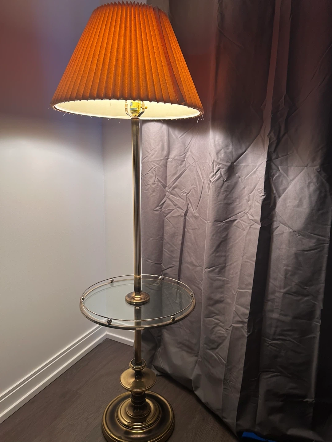 This classic floor lamp has a brass finish and a pleated orange lampshade. It features a built-in glass side table for convenience. Adds a warm glow and a handy spot for your drink! 150cm tall.