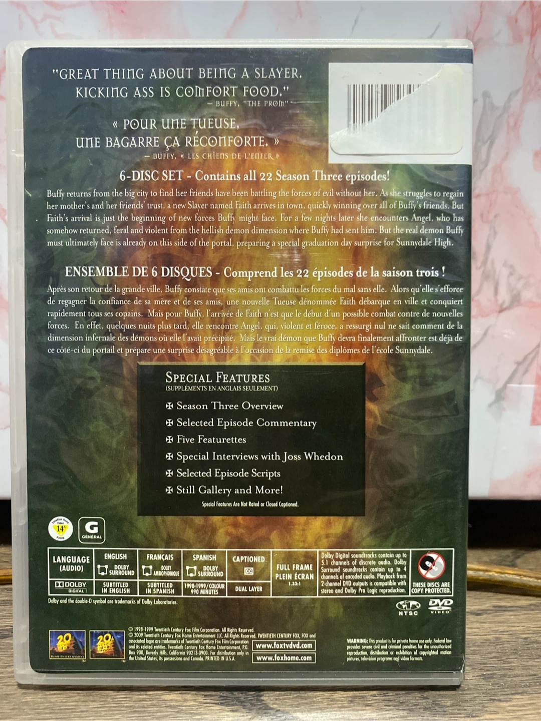 Selling Buffy the Vampire Slayer: The Complete Third Season on DVD! This 6-disc set includes all 22 episodes from the season. Enjoy special features such as episode commentary and interviews with Joss Whedon. A must-have for any Buffy fan!