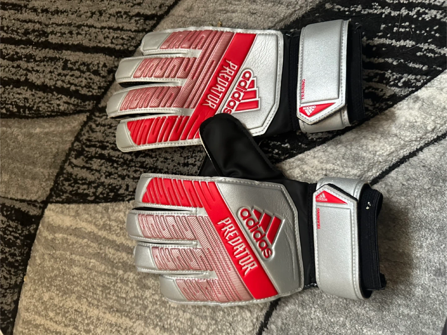 Selling a pair of Nike shin guards and Adidas Predator goalie gloves. The gloves show some wear on the palms, but are still functional. The shin guards are ready for the field!