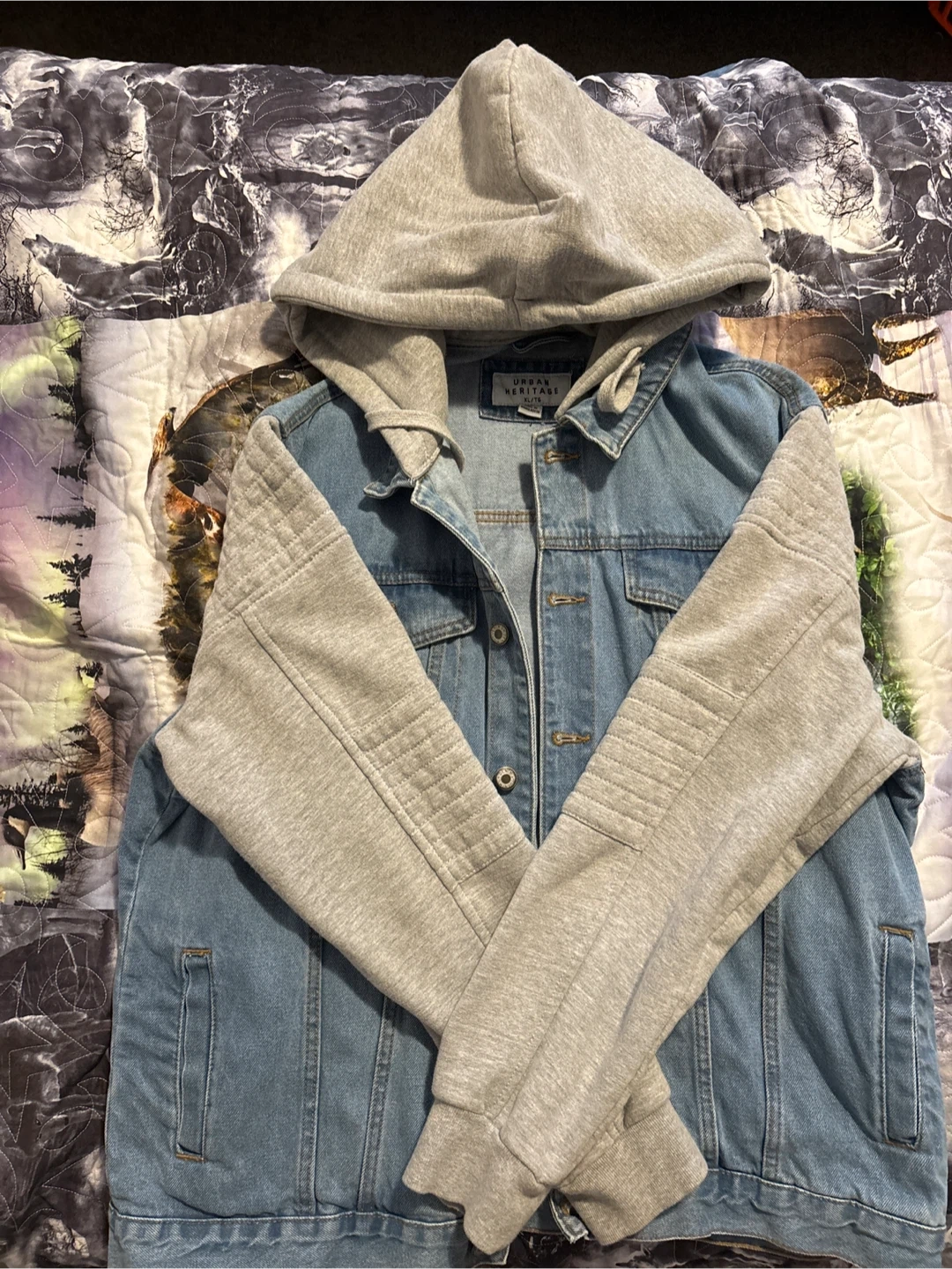 Urban Heritage denim jacket featuring a grey hoodie and sleeves. Size is XL/TG. A stylish and comfortable jacket for cooler weather!