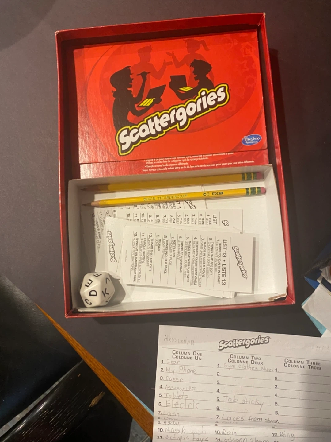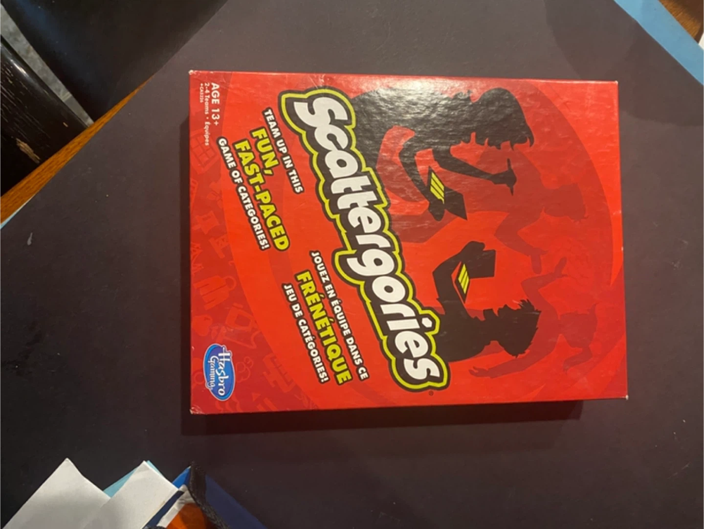 Classic Scattergories board game. Includes game board, dice, pencils, and category lists. Fun for family game nights!