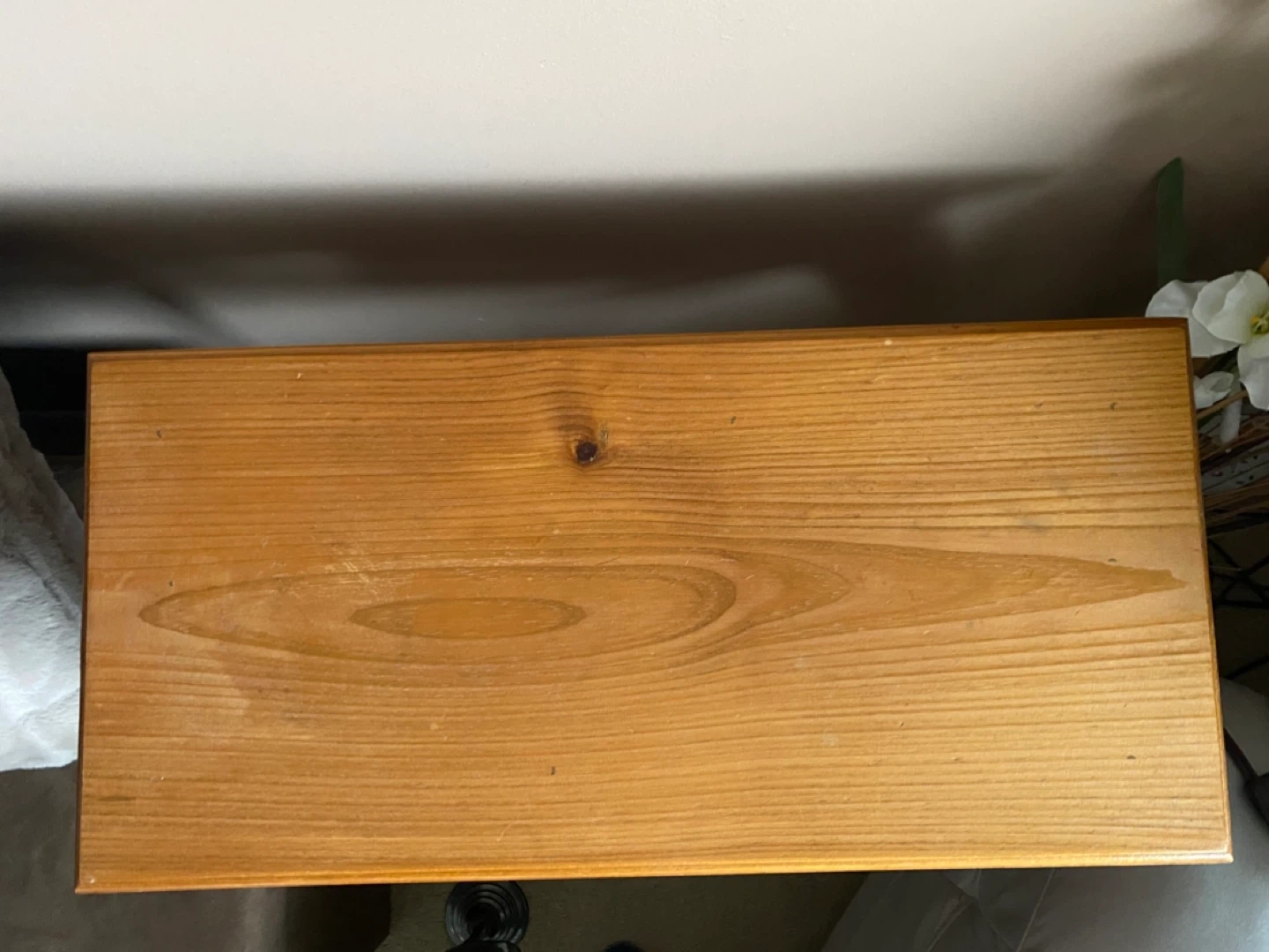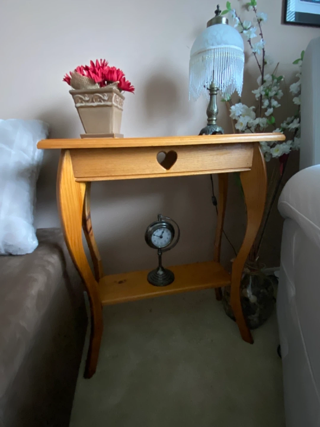 Solid vintage wood end table with decorative heart cutouts on the front and back of the table.