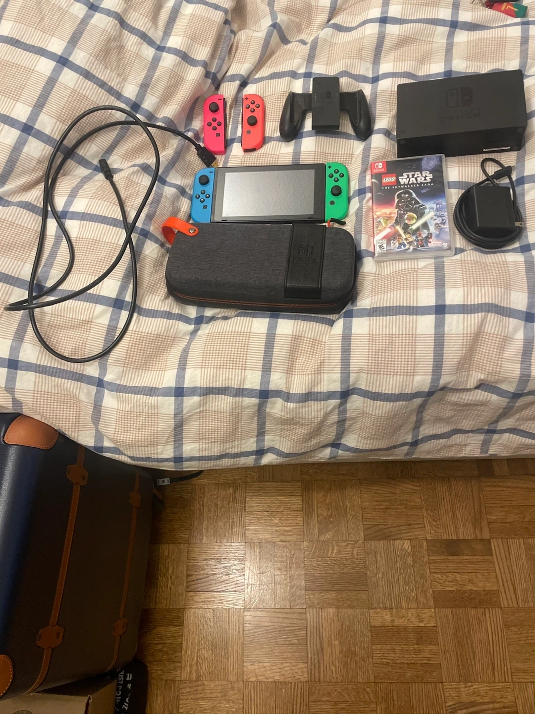 Nintendo Switch console bundle. Includes the main console, neon red and blue Joy-Cons, a grip accessory, and the Lego Star Wars: The Skywalker Saga game and NBA 2K25. Also comes with a charging cable, AC adapter, and a grey carrying case. It's ready for gaming adventures!