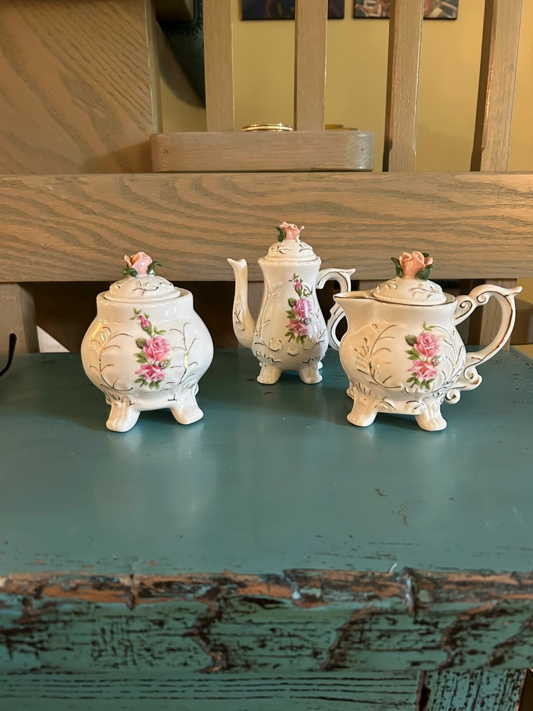 2 Vintage Tea Pots ( Mooreland Minton & Royal Worcester Juliette. Plus 5 Vintage Tea Cups and Saucers. Also included Porcelain Rose Pattern. Creamer ,Sugar Bowl and small pitcher. All items in excellent condition.