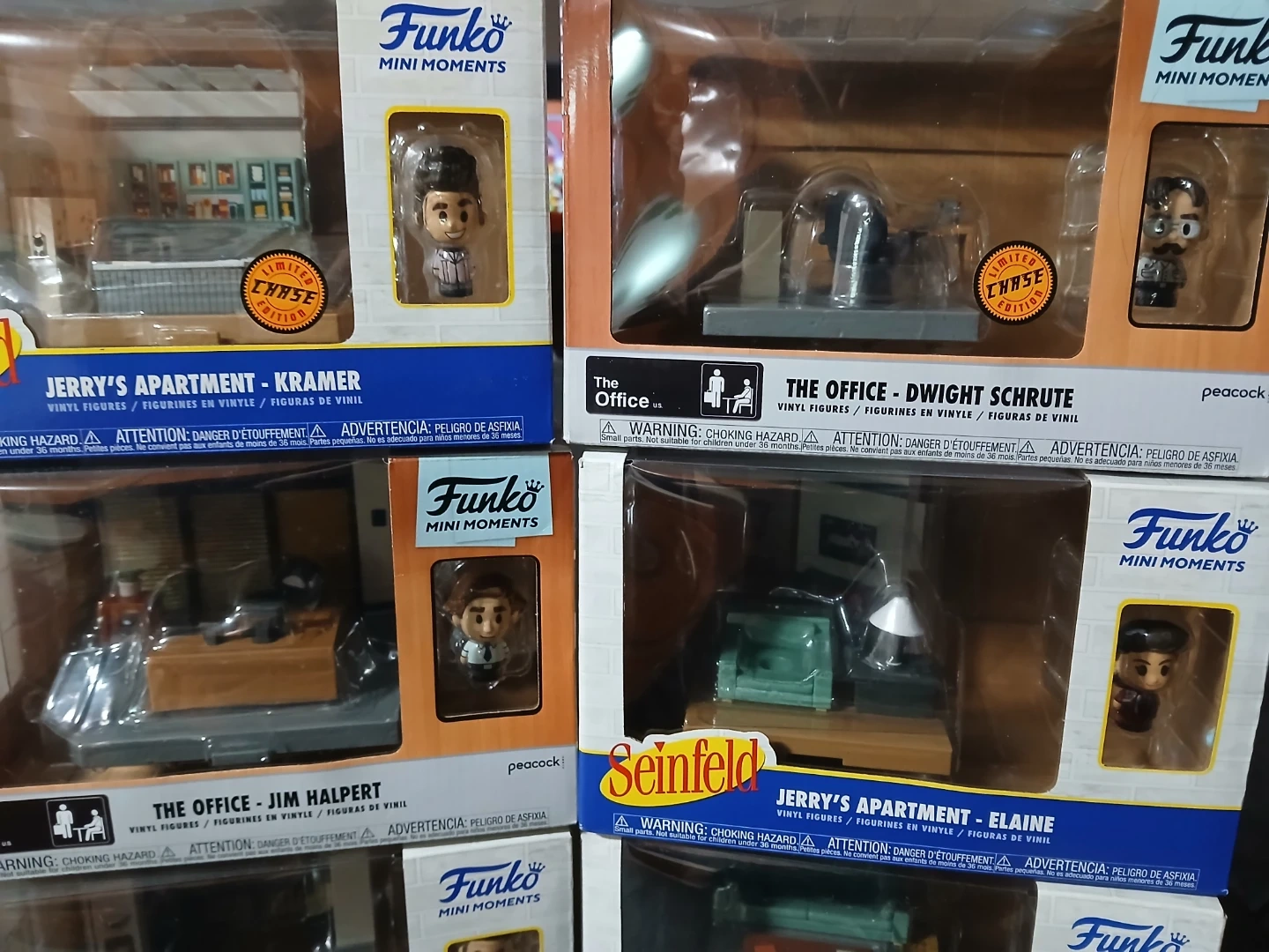 Collectible vinyl figures from Funko Mini Moments featuring characters from Seinfeld and The Office. Includes Jerry's Apartment sets and Dunder Mifflin office scenes. Perfect for fans of these classic TV shows!